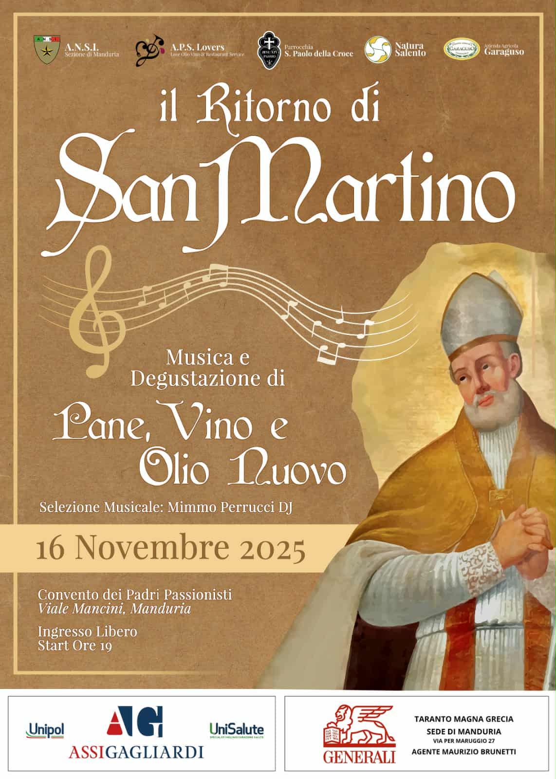 «Noi, Associazione Nazionale Sottufficiali d'Italia sezione di Manduria, dedicata alla memoria del Mar ordinario dei CC Antonio Dimitri, medaglia d'oro al valore militare, rivolgiamo un plauso ai Padri Passionisti e a coloro che si sono prodigati con il loro impegno, le cantine presenti e le aziende partners dell'evento».