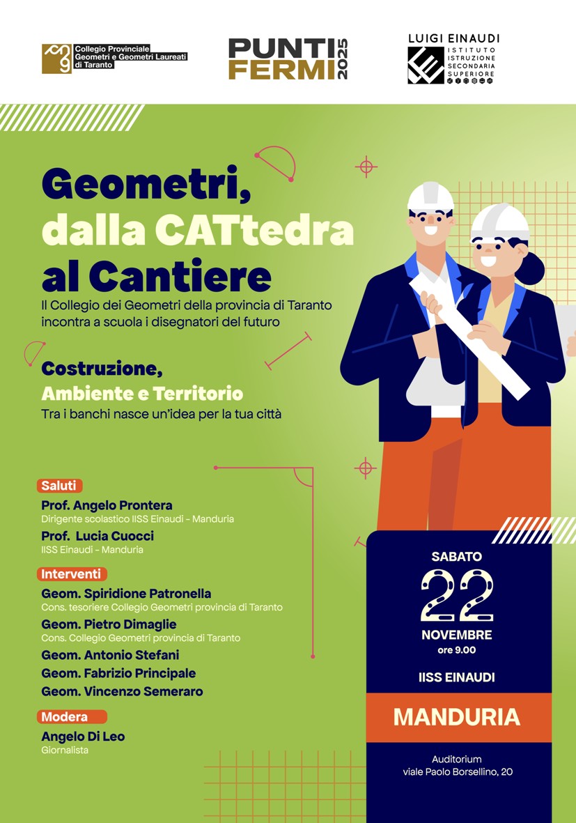 «Abbiamo deciso di incontrare studentesse e studenti nel luogo in cui si preparano per intraprendere la nostra professione, dunque a scuola» è riportato in un comunicato del Collegio dei Geometri della provincia di Taranto.