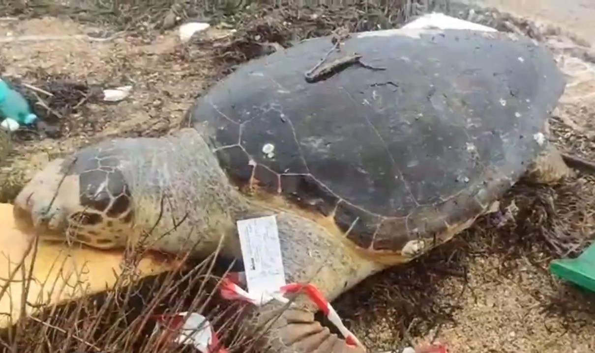 Il carapace, oltre ad essere lesionato, presentava un cordellino incastrato