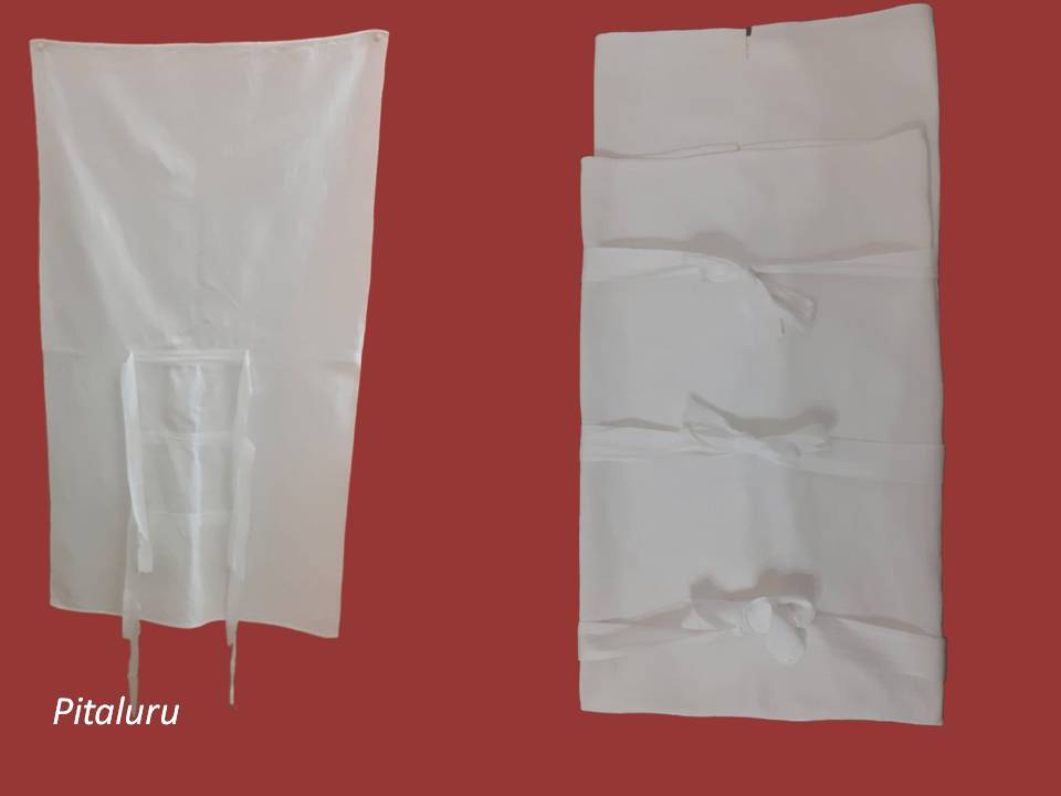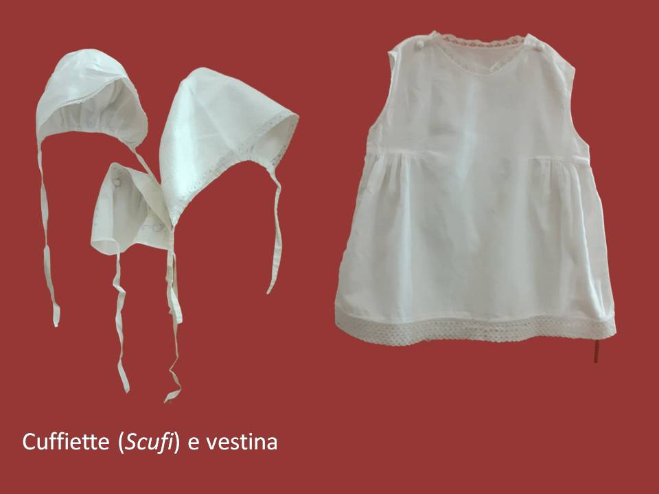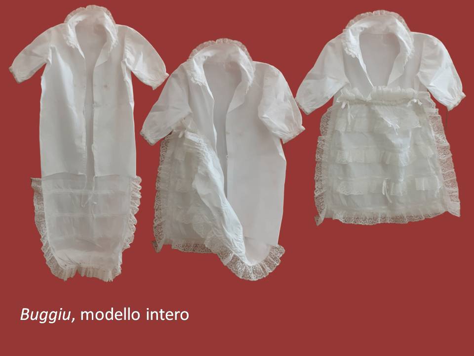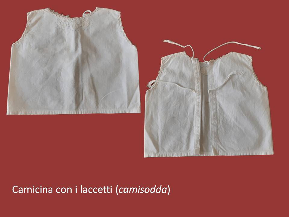 «Si mittìa prima prima lu pannolinu finu, (…) ti tessutu leggeru, linu finu finu, makò o pelle d’uovo (…), era quadratu granni, si nturtijaunu li jammiteddi e si alzava sopra, e mintii lu primu pannu, lu secondu pannu ti robba chiù pesanti, fatt’a casa, si ni mintìunu nu treti, puei lu pitaluru e ti sobbra nturtijaunu la fassa (…), lu pitaluru è chiusu ti sotta, lu mintiunu cu copri tutti ŝti cosi interni e puei jeri a mmucciari lu iddicu. Li camicini erunu nnu picca scollati, a giri, cu li laccettini retu, ti mussola erunu fini, sotta alli carnicieddi, taccati cu li laccettini, noni bbuttuni perché rimaniunu moti fiati curcati. Quiddi cu li manichi puru ti piché, tutti fatti rombi rombi. Li razzi si lassaunu liberi, puei si mintìa la camicina larga comu nu grembiulinu cu copri tutti ŝti cosi e si mintìa lu buggiu, si mintìa ti sobbra alla fassa cu no pari la fassa (…). Moti li nfassaunu sinu a sotta li ascelli. Ntra li fassi che si nturtijaunu si mintìa na medaglina celesti, era la Matonna.