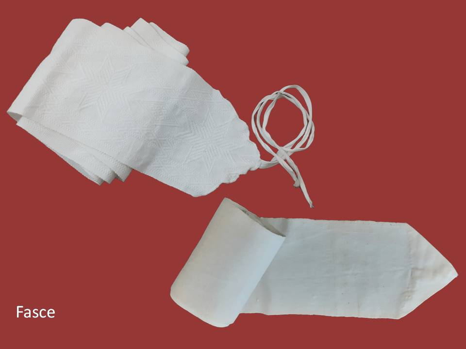 Il neonato veniva adagiato su un piano facente funzione di fasciatoio (“littèra”) e si procedeva seguendo un ben preciso ordine. Il primo ‘strato’ della fasciatura era di tessuto leggero e morbido (cotone Pelle Uovo, cotone Makò o lino), perché a contatto con la pelle delicata del bambino, aveva una forma rettangolare e misurava approssimativamente un metro di altezza per cinquanta centimetri di larghezza; esso veniva ripiegato, dapprima attorno alle gambe del bambino e poi alzato fino a coprirgli la pancia. I teli di cotone leggero erano chiamati “spràjini”. Seguivano altri due o tre teli delle stesse dimensioni, ma in cotone pesante, tessuti in casa al telaio. A questo punto compariva “lu pitarulu”, anch’esso di cotone pesante lavorato, il cui scopo era di ‘contenere’ i vari strati sistemati precedentemente, e per questo veniva chiuso con delle fascette nella parte inferiore. L’operazione continuava avvolgendo il bambino con la ‘fascia’ vera e propria (“fassa”), in cotone pesante, lunga due metri e mezzo e larga trenta centimetri, fornita di fascette alle estremità per essere legata al corpo. All’interno della fascia, era di buon auspicio inserire una medaglietta raffigurante la Vergine Maria. L’indumento ‘finale’ era “lu buggiu”, che poteva presentarsi unito, a mo’ di tutina, oppure nella variante spezzata in vita (camicina e una sacca con laccetti), preferibile, per ovvie ragioni igieniche. Nella maggior parte dei casi, i bambini venivano fasciati fino all’ombelico (compreso), lasciando libere le braccia, altre volte fino alle ascelle. In entrambi i casi si provvedeva a dotare il piccolo di morbide camicine di mussola senza maniche chiuse dietro da laccettini (“camisodddi”) e di “sciuppridduzzi”, corpetti con le maniche (in flanella o in tessuto più leggero a seconda delle stagioni). I neonati rimanevano in fasce per cinque-sette mesi secondo la stagione, in ogni caso per un numero di mesi che doveva essere dispari.