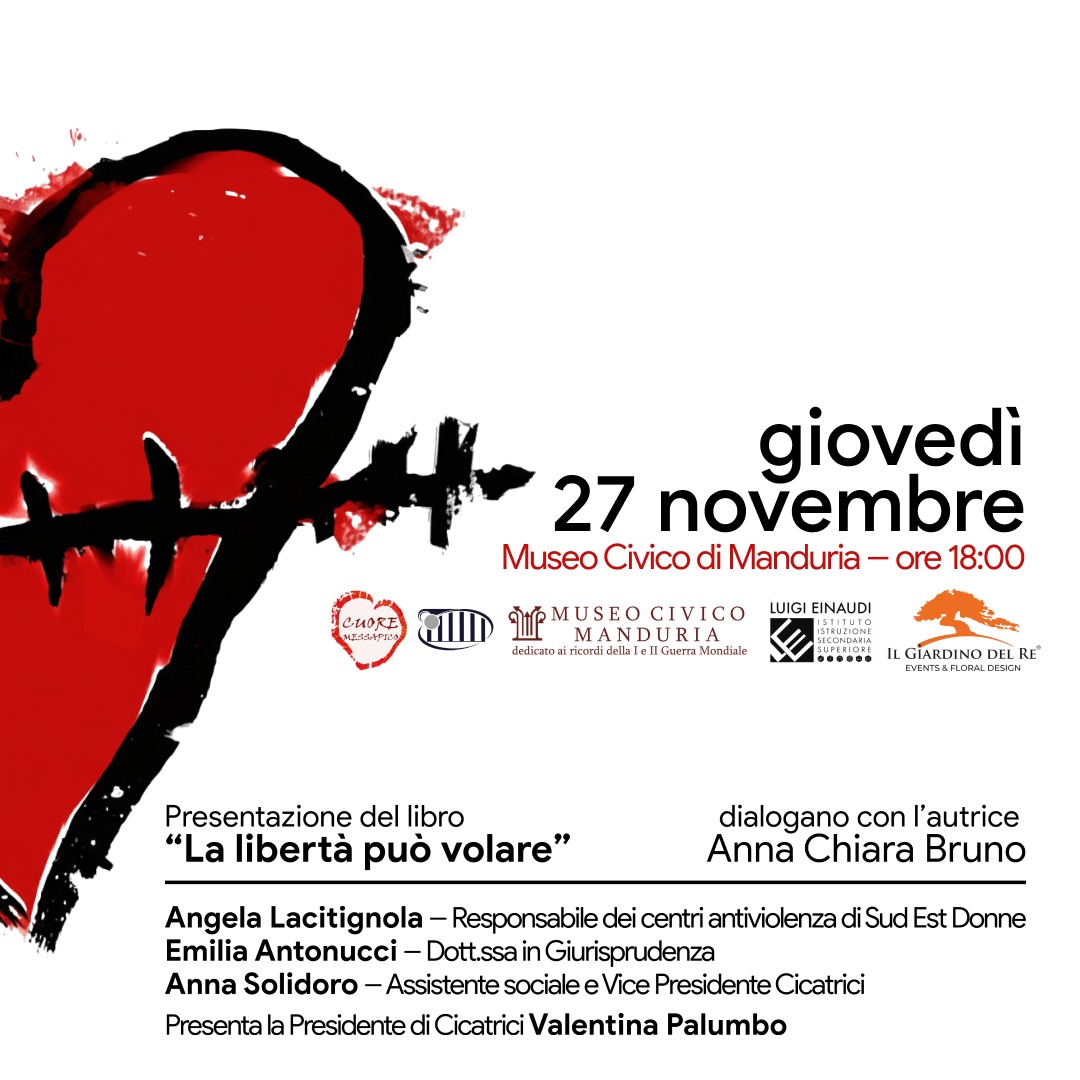 L’incontro, che si terrà giovedì 27 novembre, alle ore 18, presso il museo civico di Manduria, sarà dedicato alla presentazione del libro “La libertà può volare” scritto da Anna Chiara Bruno, che affronta con sensibilità e coraggio il tema della rinascita femminile dopo il trauma dello stalking. L’autrice dialogherà con figure di riferimento nel panorama dell’antiviolenza del territorio pugliese a partire da Angela Lacitignola, responsabile dei centri antiviolenza di Sud Est Donne e Anna Solidoro, assistente sociale e responsabile di alcune case rifugio dedicate proprio a donne vittime di violenza. Infine, con Emilia Antonucci saranno approfonditi gli aspetti normativi e le criticità del sistema di tutela. A presentare l’incontro Valentina Palumbo, presidente di Cicatrici, che introdurrà i temi della serata.