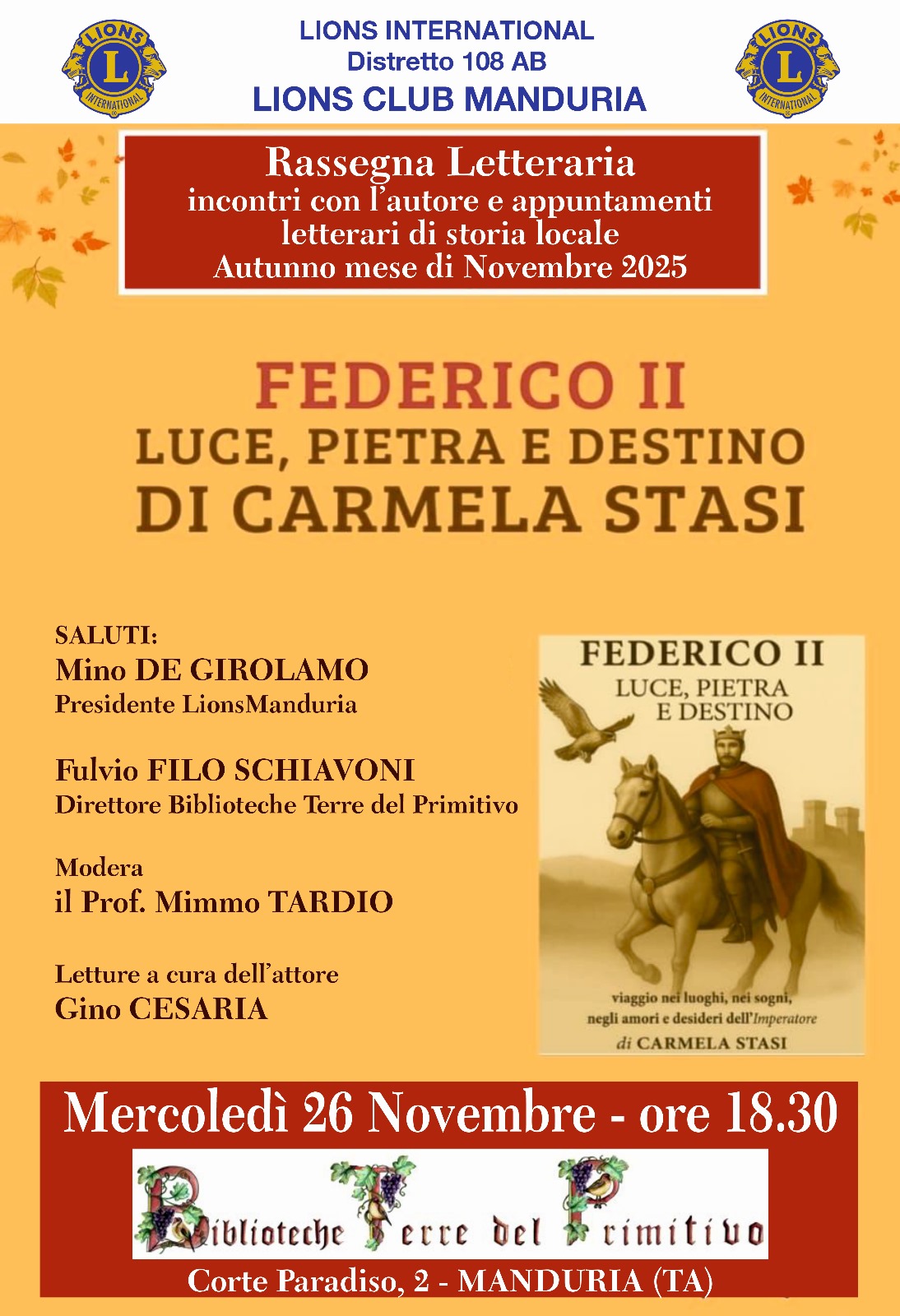 Domani sera, alle ore 18,30 su iniziativa del Lions Club Manduria, presso le Biblioteche Terra del Primitivo di Manduria (corte Paradiso 2) sarà presentato il libro “Federico II – Luce, pietra e destino” di Carmela Stasi. L’iniziativa si inserisce nella rassegna letteraria “Incontri con l’autore e appuntamenti letterari di storia locale”.