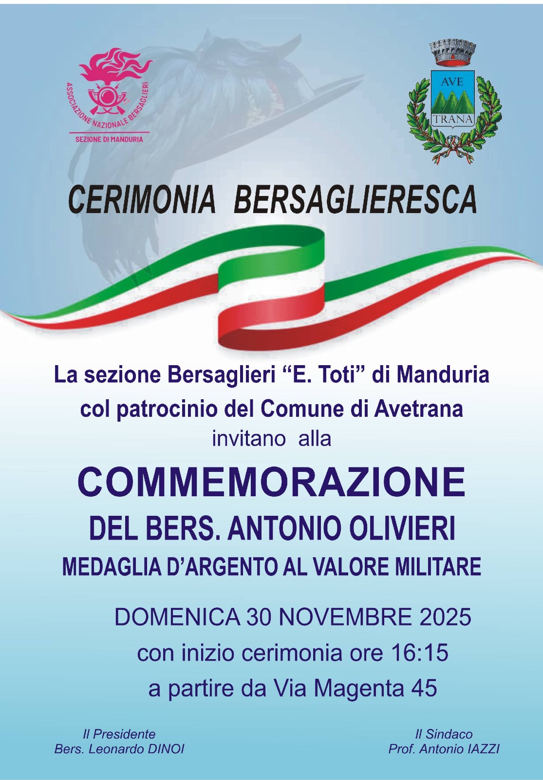 Domenica 30 novembre si svolgerà ad Avetrana la commemorazione del bersagliere Antonio Olivieri, classe 1888, nato ad Avetrana, effettivo alla Compagnia Mitragliatrici.
