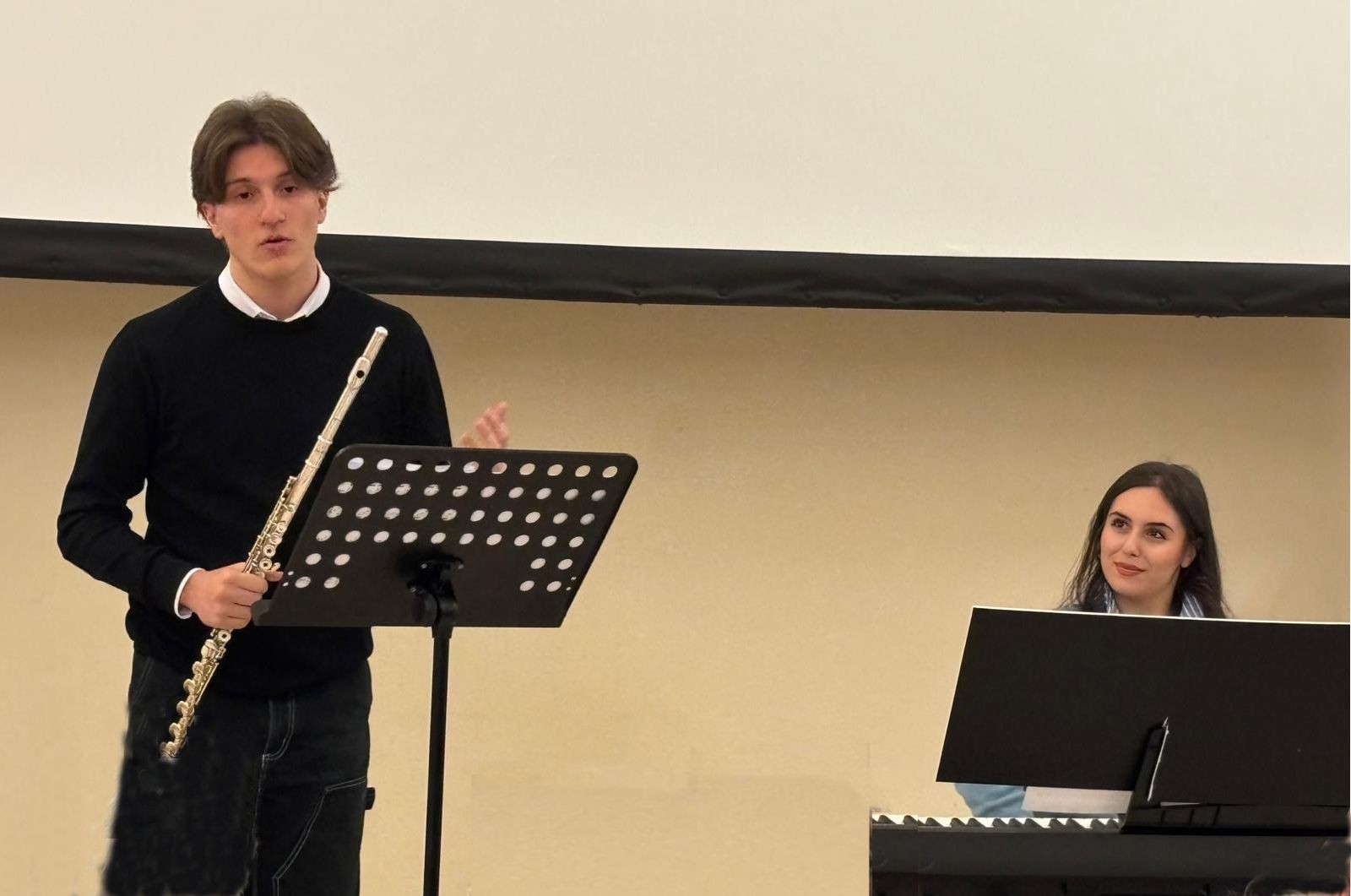 Nell’ottica di esplorare la forza di vari linguaggi espressivi è iniziata una nuova serie di incontri dal titolo “La musica racconta…”. Questo primo incontro, affidato al talento cristallino di Flavio Carlo Chimienti, al flauto ed al racconto, e di Linda Clarice, al pianoforte, ha voluto affrontare alcuni aspetti del tema conduttore di quest’anno: il “diritto di esistere”. Sono stati eseguiti i brani “Gabriel ‘s Oboe”, tratto dal film The Mission, di Ennio Morricone, e “Comptine d'un autre été”, dal film Il favoloso Mondo di Amélie, di YannTiersen. Brani tratti da colonne sonore di film importanti, che mettono al centro il diritto di esistere del popolo indigeno dei Guarani, in The Mission, e il diritto di essere sé stessi, in Il favoloso Mondo di Amélie. Ma appare limitativo il termine eseguire; la carezza suadente della musica espressa da questi giovani che cercano di comunicare con un linguaggio potente ha avvolto gli ascoltatori; emozioni forti e coinvolgenti hanno attraversato la sala. Il racconto di Flavio Chimienti ha contrappuntato i brani eseguiti; dal commento alla musica ed ai suoi autori fino all’approccio a temi attuali quali la violenza, le guerre, la ricerca della propria via in questo mondo. Temi forti, spesso divisivi; ma in questo primo magico incontro tutto è invece, incredibilmente, stato declinato con leggerezza, con un tocco lieve che solo la sottolineatura musicale, affidata alla sensibilità dei giovani esecutori, ha potuto regalarci.