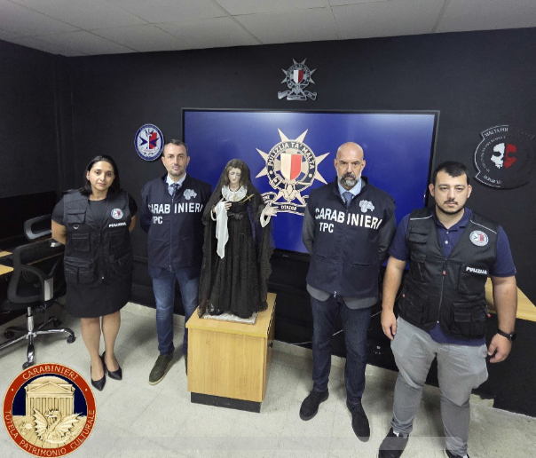 Il bene ecclesiastico, trafugato il 16 marzo 2025 all’interno della cappella dell’Addolorata del cimitero comunale di Lecce, era stato messo in vendita su alcune piattaforme di e-commerce per la somma di 1.500 euro. Gli accertamenti svolti dai militari dell’Arma hanno consentito di localizzare la statua a Malta (La Valletta) nella disponibilità di un collezionista nel settore d’arte.