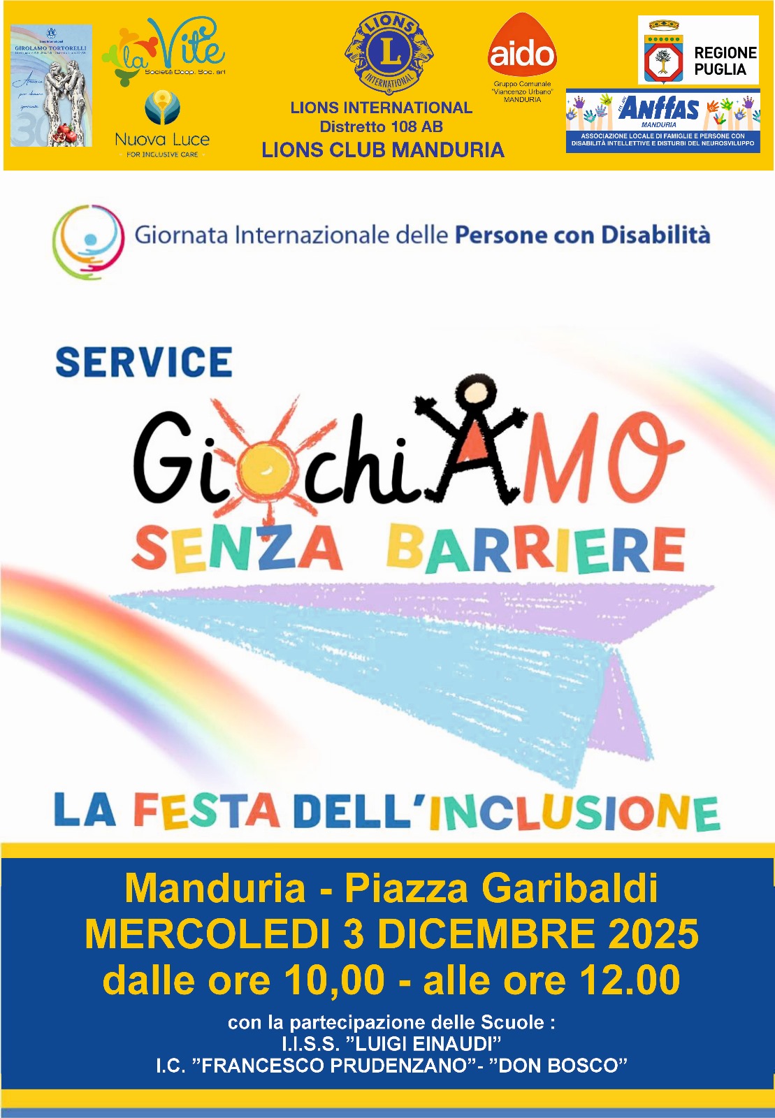 In occasione della “Giornata internazionale dei diritti delle persone con disabilità”, il Lions Club Manduria, insieme all’associazione ANFFAS, all’AIDO di Manduria, alla cooperativa Sociale Nuova Luce, alla cooperativa sociale La Vite, all’I.I.S.S. Luigi Einaudi di Manduria, all’I. C. Prudenzano-Don Bosco e con il patrocinio della Regione Puglia, promuove per domani (mercoledì), dalle ore 10 alle 12, in piazza Garibaldi, il service “Giochiamo senza barriere, la festa dell’inclusione”, manifestazione nata per promuovere, l’inclusione e il benessere delle persone con disabilità. Sarà un momento di gioia, divertimento e condivisione!