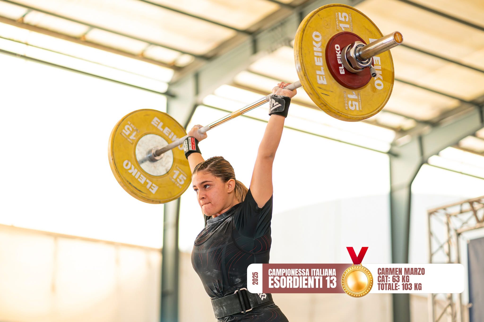 Domenica invece la giornata è stata aperta dalle gare di Carmen Marzo, che domina la sua categoria con un totale di 103 kg sollevati (43+60), portando a termine la gara perfetta con 6 prove su 6 valide e il meritatissimo titolo di campionessa italiana con 24 kg di vantaggio sulla seconda.