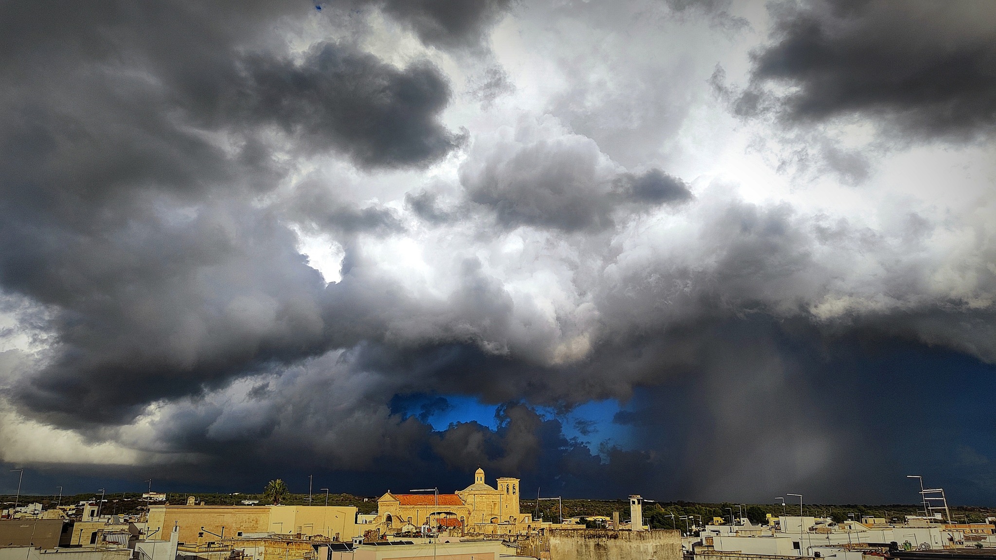 Nuvole e un mix di colori in questo suggestivo scatto: sullo sfondo la chiesa Madre di Maruggio