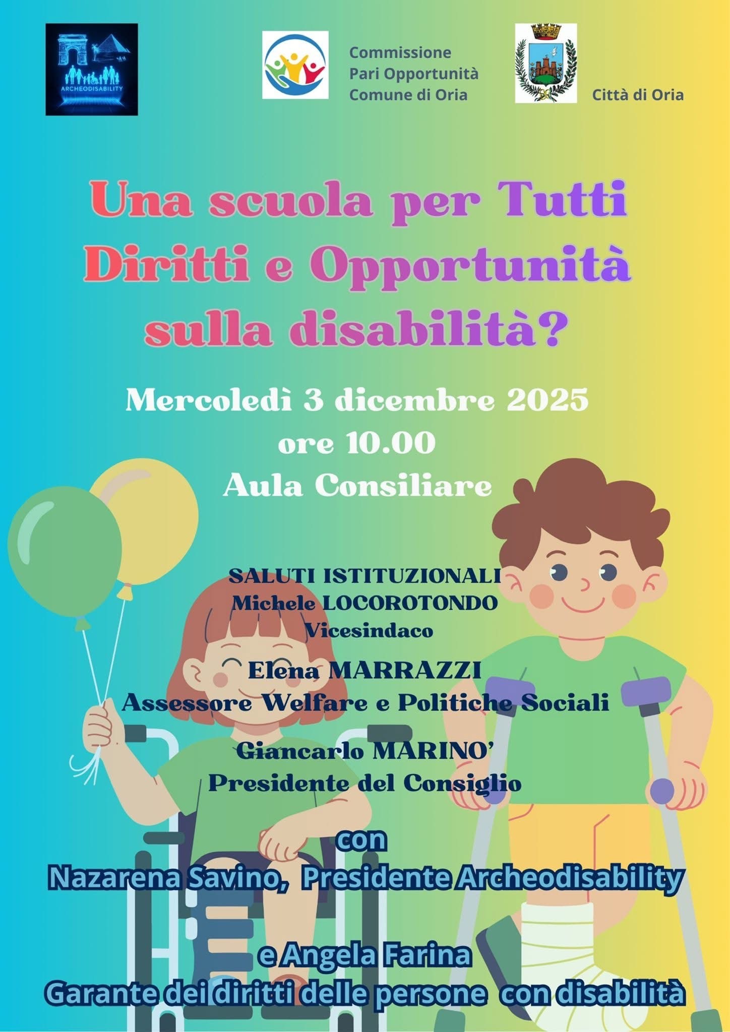 Nell’aula consiliare del Comune di Oria si è respirata oggi un’atmosfera carica di emozione, partecipazione e speranza. In occasione della Giornata Internazionale delle Persone con Disabilità, l’Amministrazione comunale, insieme alla Commissione Pari Opportunità, ha promosso un incontro dal forte valore educativo e umano.