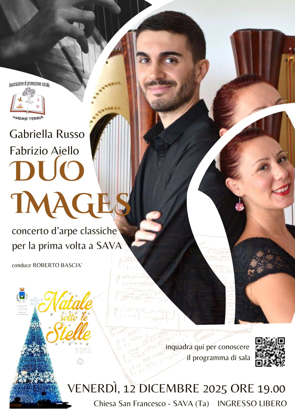 Sarà una vera e propria esclusiva quella che l’associazione “Madre Terra” di Sava ha previsto per venerdì 12 dicembre, alle ore 19. Le arpe classiche del Duo Images dei maestri Fabrizio Aiello e Gabriella Russo saranno protagonisti di un concerto unico nel suo genere, per la prima volta a Sava.