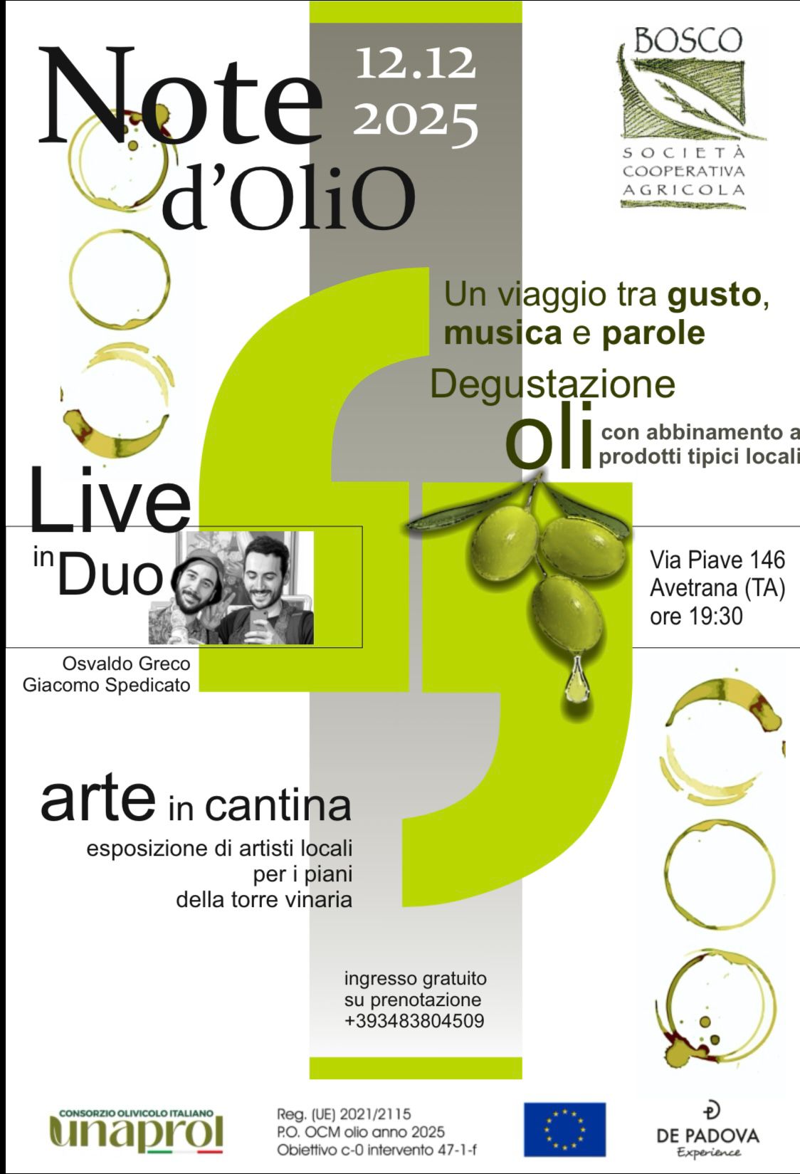 Note d’Olio, questa sera (a partire dalle 19,30), presso la società cooperativa agricola Bosco, in via Piave 146: un viaggio tra gusto, musica e parole