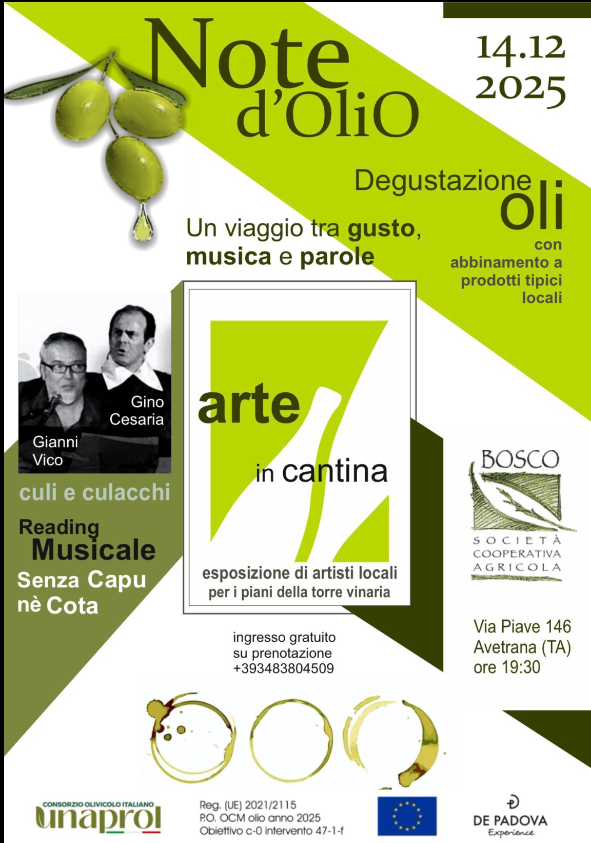Sarà possibile degustare gli oli con abbinamento a prodotti tipici locali e visitare la mostra “Arte in cantina”, un’esposizione di artisti locali per i piani della torre vinaria.