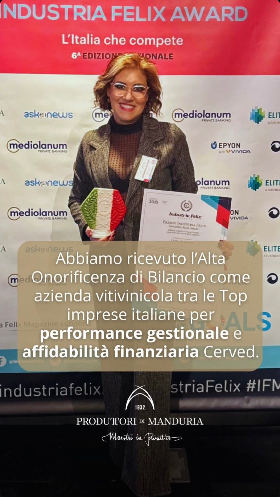 Industria Felix, le foto della premiazione a Milano dei Produttori di Manduria: la vinicola è fra le 17 imprese pugliesi più competitive.