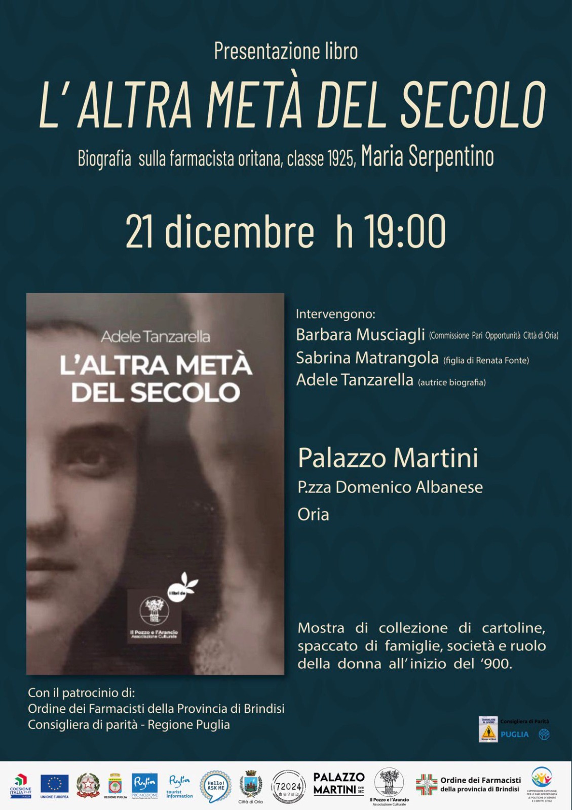 Domenica 21 dicembre, alle ore 19, a palazzo Martini (piazza D. Albanese) in Oria, sarà presentato il libro “L’altra metà del secolo”, opera di Adele Tanzarella dedicata alla figura della farmacista Maria Serpentino, nel centenario della sua nascita.