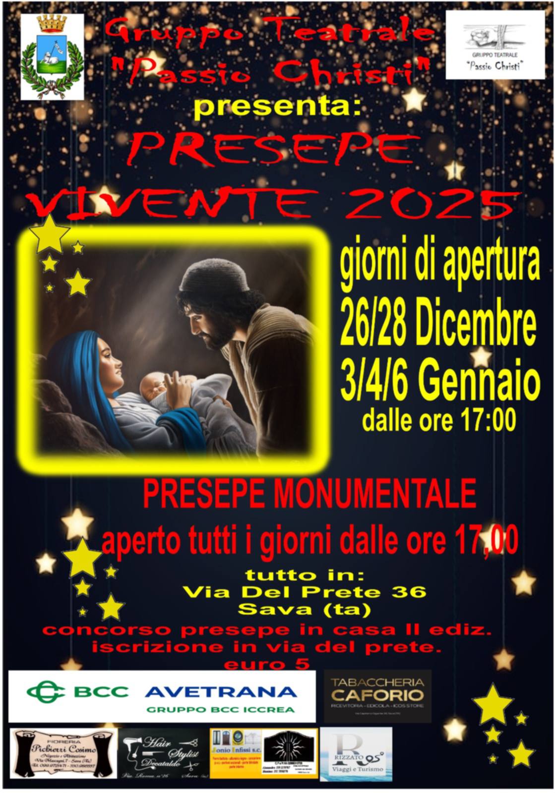 Il gruppo teatrale “Passio Christi” di Sava anche quest’anno propone un presepe artistico aperto al pubblico in via Del Prete 36, casa concessa gentilmente per l’occasione dall’avvocato Parlatano.
