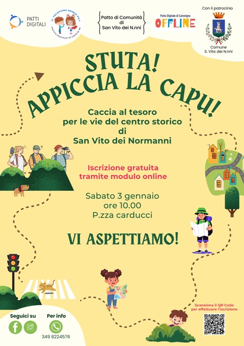 I gruppi dei Patti Digitali di San Vito, Ceglie Messapica e Carovigno annunciano un’iniziativa originale e divertente: la Caccia al Tesoro di San Vito dei Normanni, in programma il prossimo 3 gennaio, alle ore 10 in piazza Carducci.