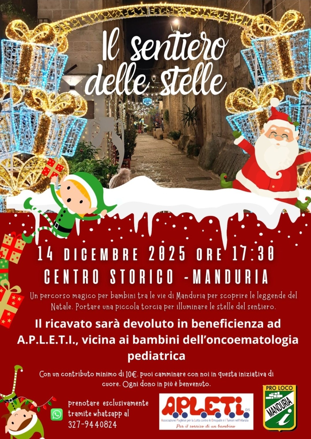 Si è concluso con grande partecipazione ed emozione “Il Sentiero delle Stelle”, l’evento natalizio organizzato dalla Pro Loco di Manduria con l’obiettivo di unire la comunità nel segno della solidarietà e dell’attenzione verso i più piccoli.