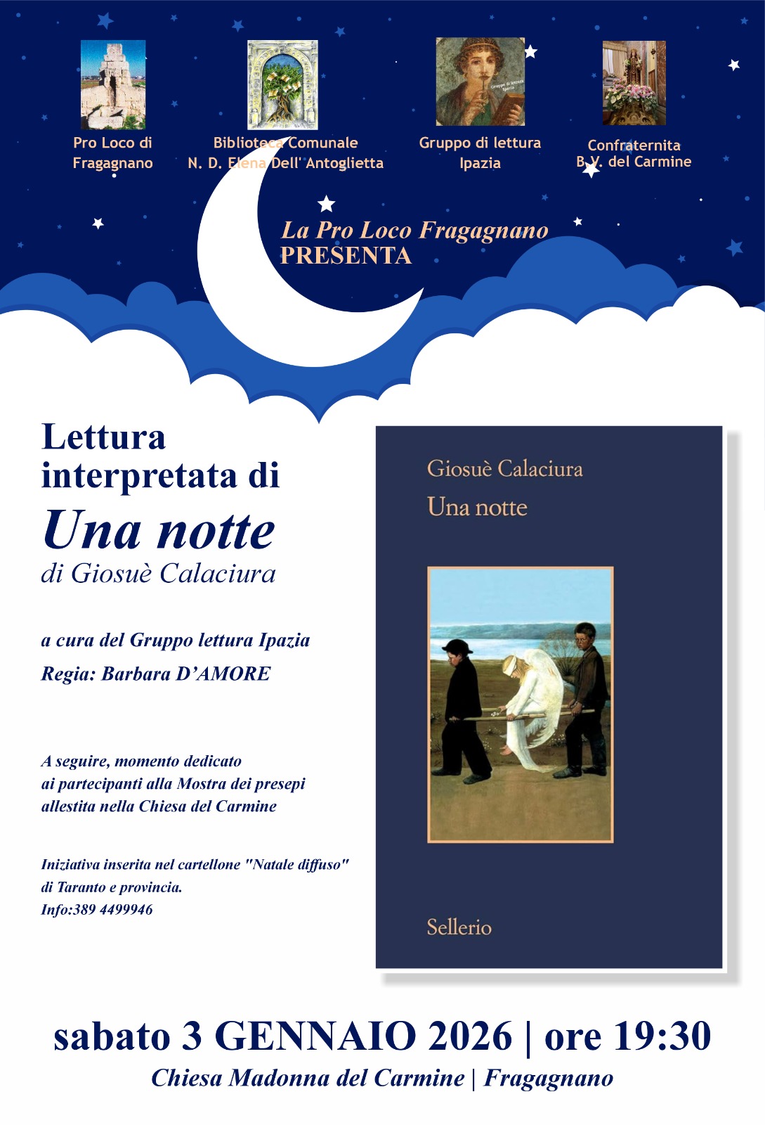 La Pro Loco di Fragagnano promuove un appuntamento culturale di grande rilievo: la lettura interpretata del romanzo “Una notte” di Giosuè Calaciura, a cura del Gruppo di lettura Ipazia, con la regia di Barbara D’Amore, nella suggestiva cornice della chiesa del Carmine di Fragagnano.