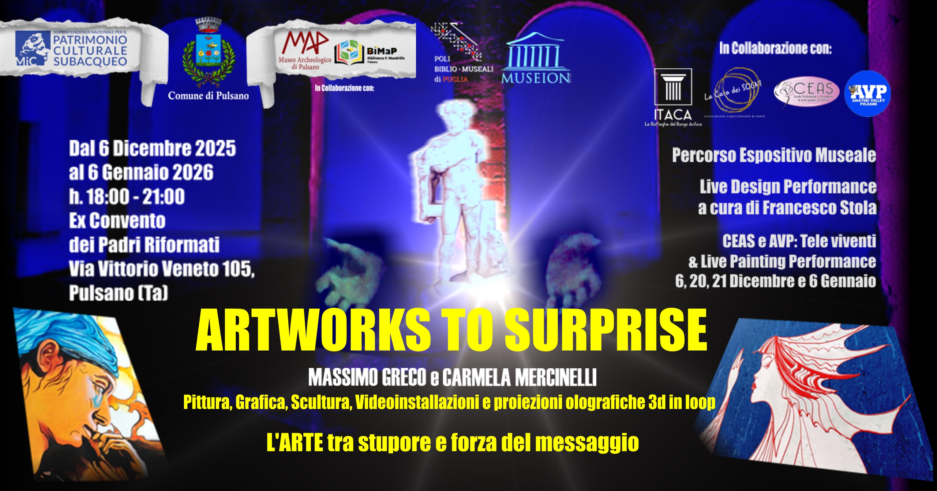 Il MAP - Museo Archeologico di Pulsano, situato nell’Ex Convento dei Padri Riformati, si trasforma in un laboratorio di riflessione contemporanea con la rassegna “Artworks To Surprise”. Il percorso espositivo, che vede protagonisti Massimo Greco e Carmela Mercinelli, propone un'esperienza immersiva dove l'archeologia dialoga con pittura, grafica e installazioni olografiche.