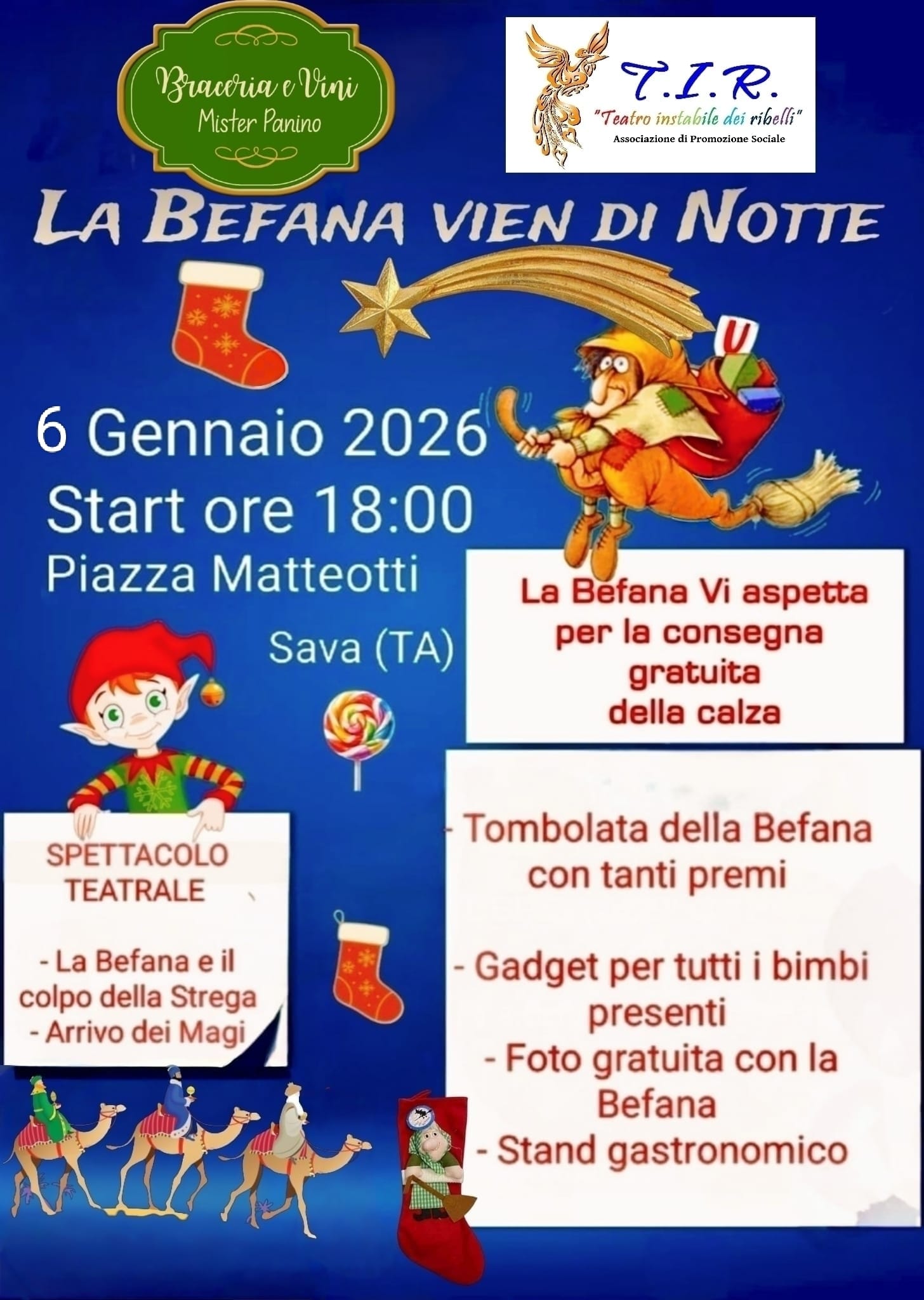 Quando il sipario calerà, la magia non svanirà. La Befana, con il suo sorriso scintillante, resterà tra noi, pronta a condividere tesori. Dalle sue mani generose, usciranno gratuitamente calze colme di sorprese offerte dalla braceria Mister Panino di Giuseppe Storino. E poi, uno ad uno, i bambini potranno catturare un ricordo indelebile, una foto con la Befana e gadgets. Ma la serata non finirà qui! Ci saranno stand gastronomici e la Befana ci inviterà a giocare a tombola, con fantastici premi gentilmente offerti dalle attività commerciali savesi Prestige, Desideri Profumeria, Royal non solo Argenti, Nuova Cartotecnica da Donatella, Art Attack Cartoleria, Linea Sport di Tomai, Il Paese dei Balocchi. Un evento che celebra l'infanzia, la magia e la speranza, ricordandoci che, come la Befana, ognuno di noi può portare un po' di gioia nel mondo. Non mancate!