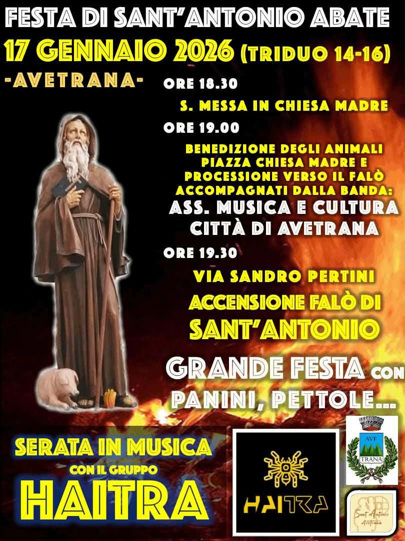 Il giorno della festa, 17 gennaio, alle ore 19, nel piazzale della chiesa ci sarà la benedizione degli animali. In processione, accompagnati dalla banda - Ass. Musica e Cultura Città di Avetrana, si raggiungerà via S. Pertini, dove avverrà l'accensione del falò.