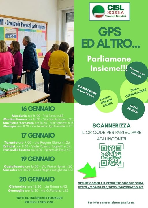 La Cisl Scuola Taranto Brindisi ha programmato, per i prossimi 16 – 17 – 19 – 20 gennaio, un calendario di incontri propedeutici all’imminente emanazione dell’ordinanza per il rinnovo delle Graduatorie provinciali per le supplenze (Gps).