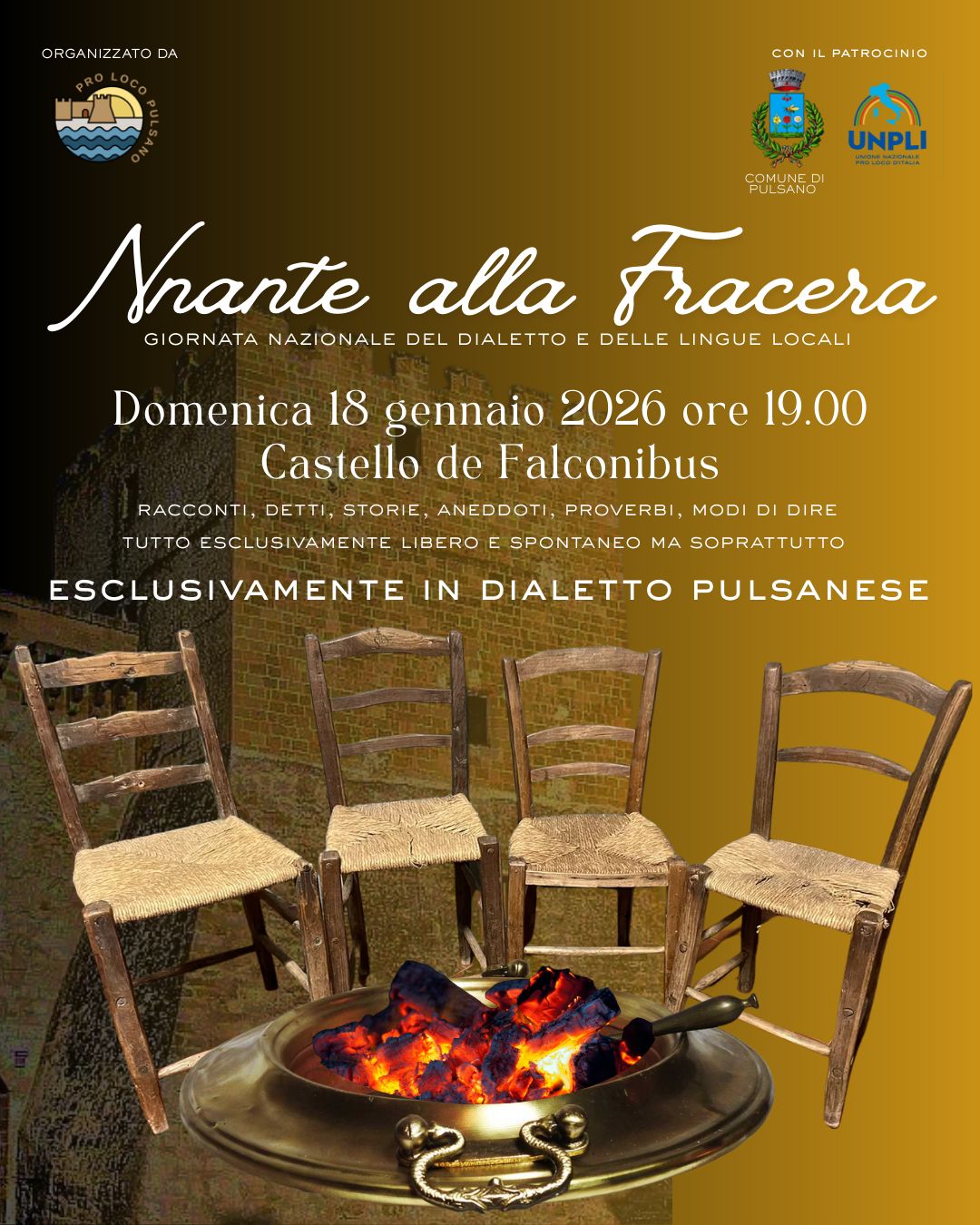 “Nnante alla Fracera” nasce con l’obiettivo di tutelare, valorizzare e tramandare il dialetto pulsanese, patrimonio immateriale della comunità e autentica espressione della sua storia, delle sue tradizioni e del sentire collettivo. Il dialetto non è solo lingua, ma memoria, identità e strumento di coesione sociale, capace di raccontare Pulsano attraverso parole, suoni ed espressioni uniche.