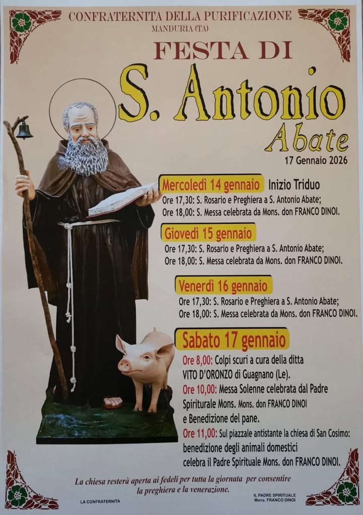 Inizia questa sera il triduo di preparazione alla festa in onore di S. Antonio Abate. Questo il programma approntato dalla Confraternita della Purificazione e dal padre spirituale mons. Franco Dinoi.