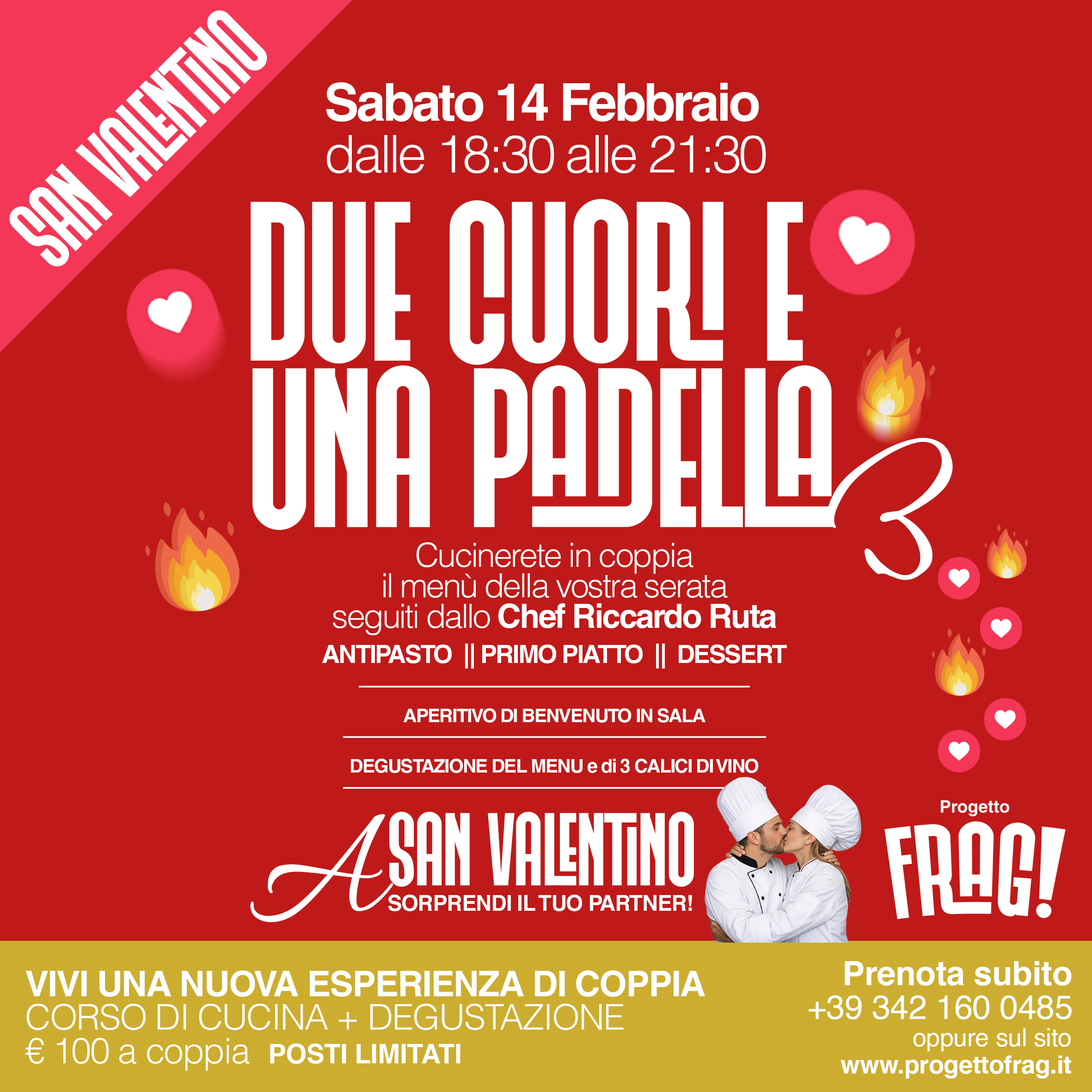 L’amore, come il buon cibo, ha bisogno di tempo, attenzione e condivisione di gesti autentici. In una terra dove la convivialità è cultura e la cucina è espressione d’amore, nasce “Due cuori e una padella”, un’esperienza di coppia proposta dalla scuola di cucina Progetto Frag! per celebrare San Valentino tra i sapori autentici della Puglia.
