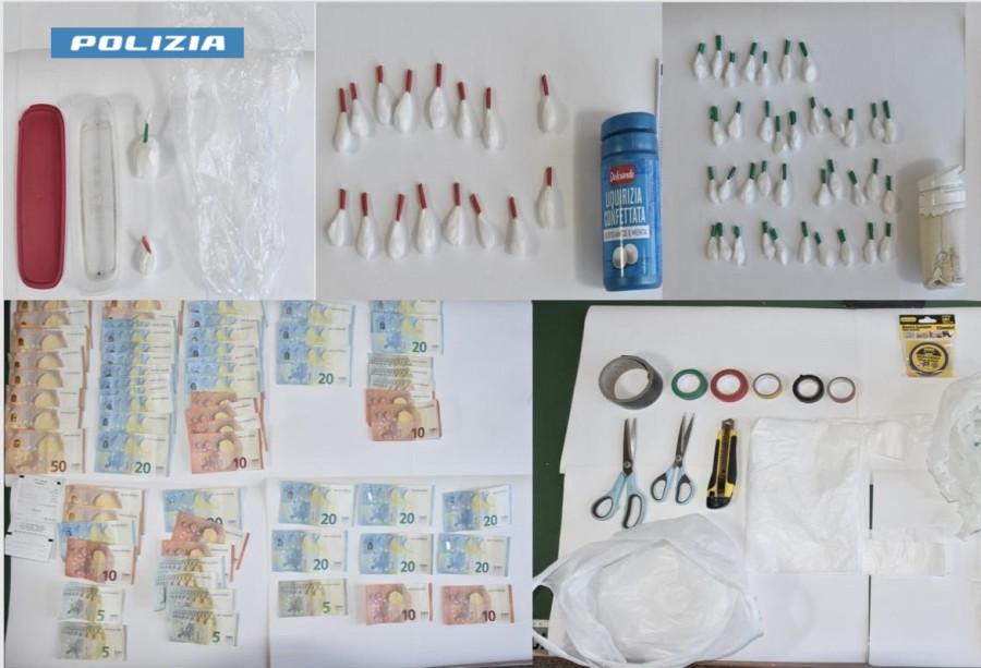 Rinvenuti, già suddivisi in dosi pronte per la vendita, 35 grammi di cocaina, 8 grammi di hashish, materiale per il confezionamento e denaro contante pari a 1.500 euro