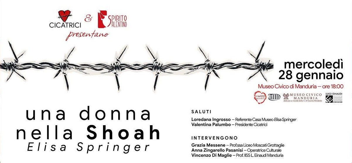 Le associazioni Cicatrici e Spirito Salentino presentano: “Una donna nella Shoah: Elisa Springer”. Un momento dedicato alla figura di Elisa Springer, cittadina onoraria di Manduria e instancabile testimone degli orrori della Shoah proprio in occasione del Giorno della Memoria.