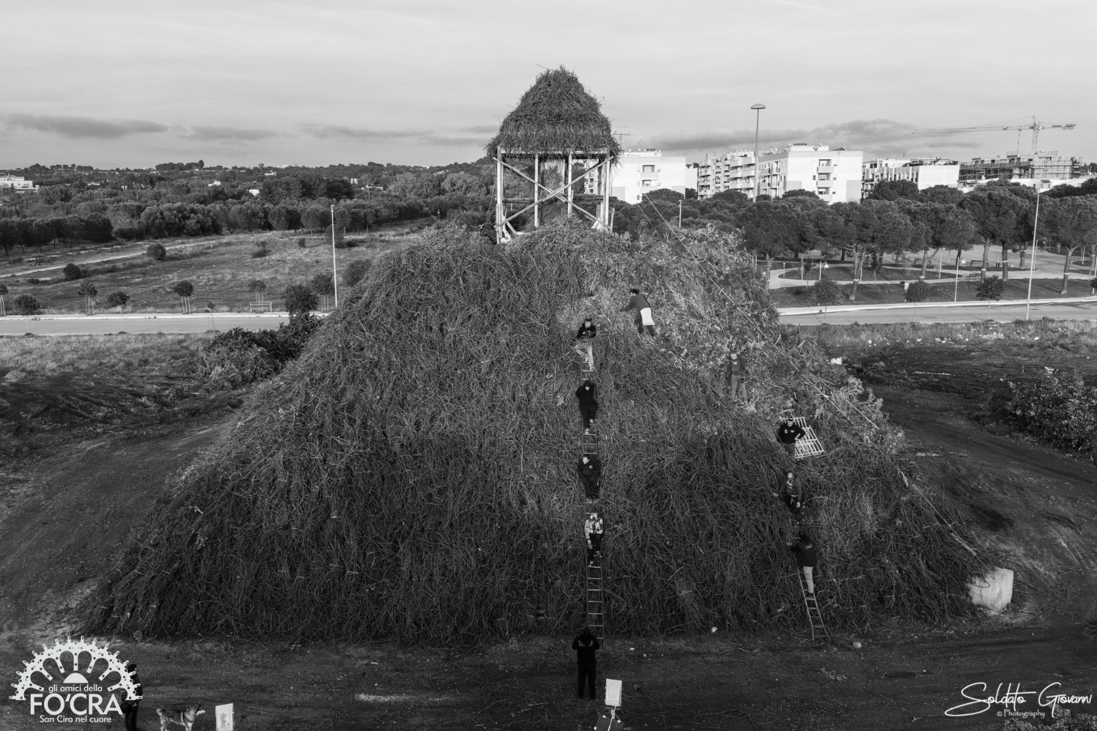 La costruzione della pira a Grottaglie è iniziata il 13 ottobre 2025 e culminerà il 30 gennaio alle ore 20, con il rito di accensione che avverrà dall’interno della camera di combustione. Dopo il gesto istituzionale del sindaco Ciro D’Alò e la benedizione dell’arcivescovo metropolita di Taranto mons. Ciro Miniero e del parroco della «Collegiata» di Grottaglie l’arciprete don Eligio Grimaldi, il fuoco verrà innescato dal basso: l’effetto camino guiderà la fiamma lungo l’asse centrale fino alla sommità, svelando progressivamente alla folla una pira che, in realtà, brucia già silenziosa al suo interno. L’accensione sarà accompagnata da un concerto di brani epici con uno spettacolo piro-musicale (nel rispetto dei codici eco-animalisti) illuminato dalle tradizionali luminarie patronali. Seguirà una due giorni di eventi sul palco allestito di fronte alla Fo’cra: il 30 gennaio si esibirà il gruppo folk salentino I Calanti, mentre il 31 gennaio saliranno sul palco i Libera Nos A Malo, tribute band ufficiale di Ligabue. Le serate saranno presentate dall’artista Sandra Santoro, con postazioni enogastronomiche dedicate alla tradizione pugliese e ai prodotti legati alla festa di San Ciro.