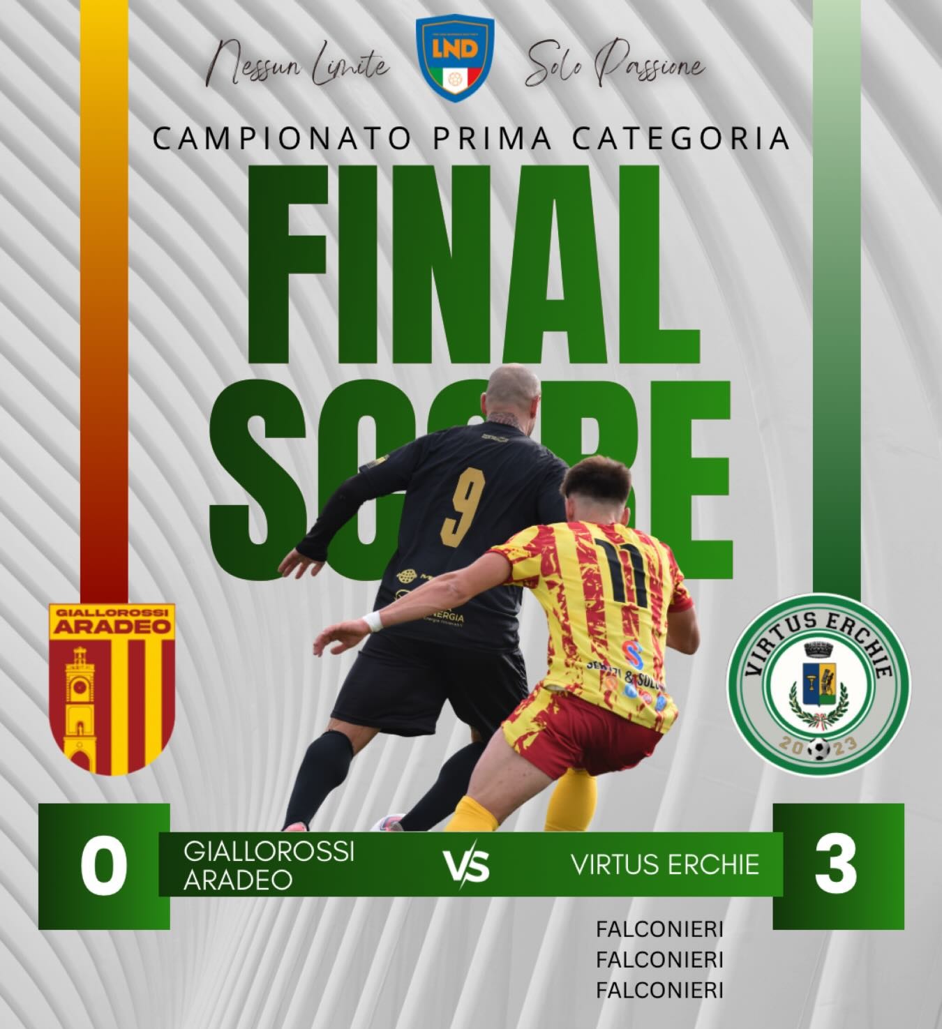 E’ la sintesi della trasferta di ieri della Virtus Erchie in casa dei Giallorossi Aradeo. Poco più di allenamento, con le orecchie rivolte verso quel che accadeva a Ruffano, dove la Città di Avetrana si è trovata anche in vantaggio con il punteggio di 3-2 e ha poi perso (4-3) con una rete subita poco prima del triplice fischio. La testa, crediamo, era invece già rivolta a domenica prossima, a quei 90 minuti, cioè, che potrebbero decidere le sorti di questo campionato.