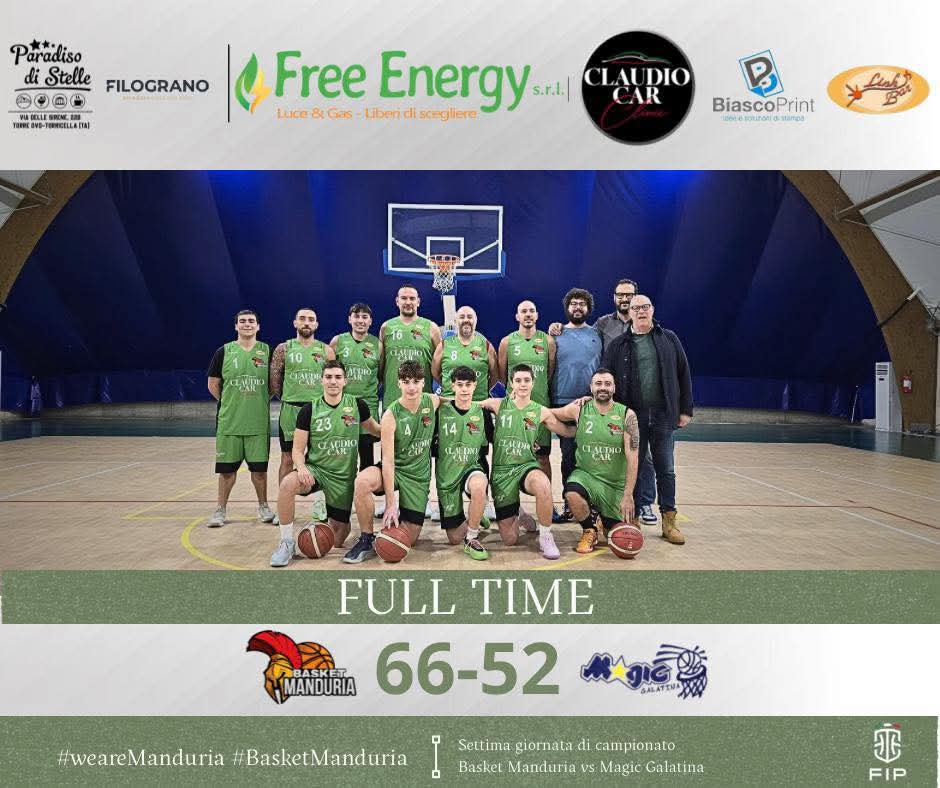 Prosegue senza alcuna macchia il cammino del Basket Manduria nel torneo di Divisione Regionale 3 di pallacanestro. Ieri, nella gara interna contro la Magic Galatina, è maturata la settima vittoria (in sette giornate) per la squadra di coach D’Amicis: 66-52 il punteggio finale.