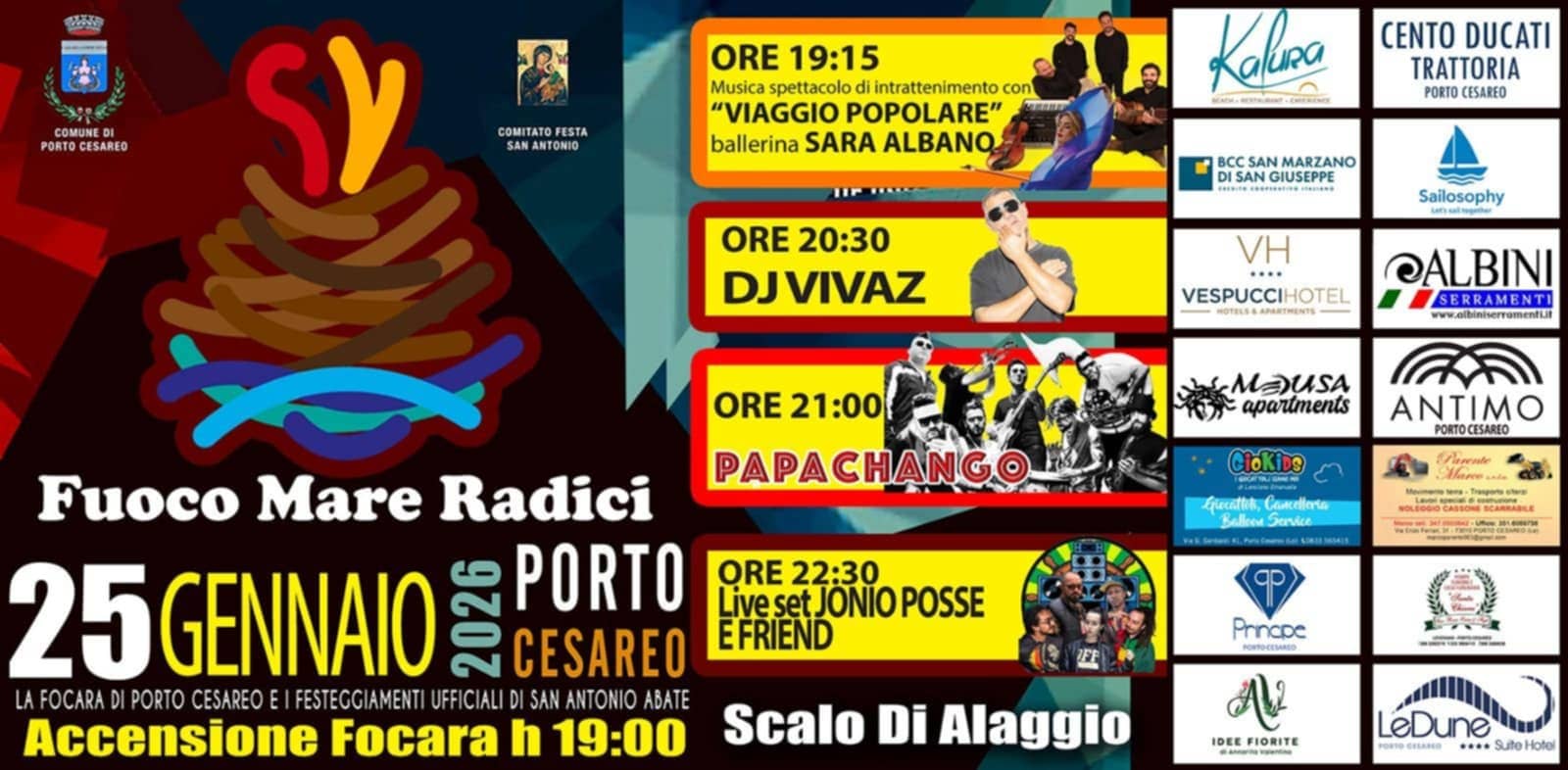 Fuoco, mare, radici. Tre indizi che ci portano nel cuore di Porto Cesareo, dove l’associazione così denominata, proporrà la 88ª Edizione della Focara Cesarina in onore a Sant’Antonio Abate, in programma domenica 25 gennaio dalle 19 presso Piazzale Berlinguer, meglio noto come Scalo d’Alaggio.