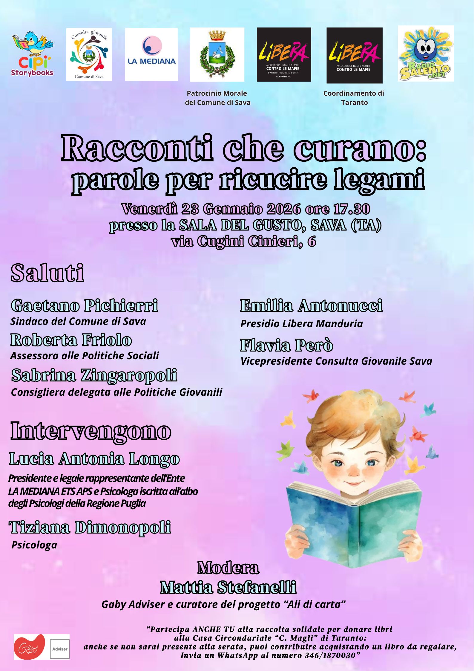L’incontro sarà occasione per presentare il progetto "Ali di Carta", nato dalla collaborazione tra Libera Manduria, CipìStorybooks (Mattia Stefanelli), la Consulta Giovanile di Sava, il coordinamento provinciale di Libera Taranto, RadioSalento.net e La Mediana ETS, con l’obiettivo di donare testi per bambini alla casa circondariale “Carmelo Magli” di Taranto. Un gesto concreto per alimentare la relazione affettiva tra genitori detenuti e i loro figli, attraverso il potere delle storie e della lettura condivisa.