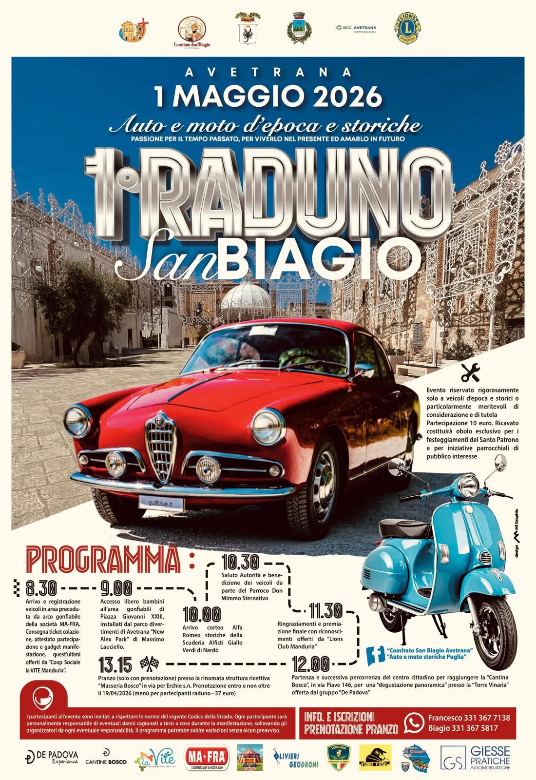 In occasione dei festeggiamenti 2026 in onore di San Biagio, il 1° maggio si terrà ad Avetrana la primissima edizione del Raduno San Biagio, raduno di auto e moto d’epoca e storiche.