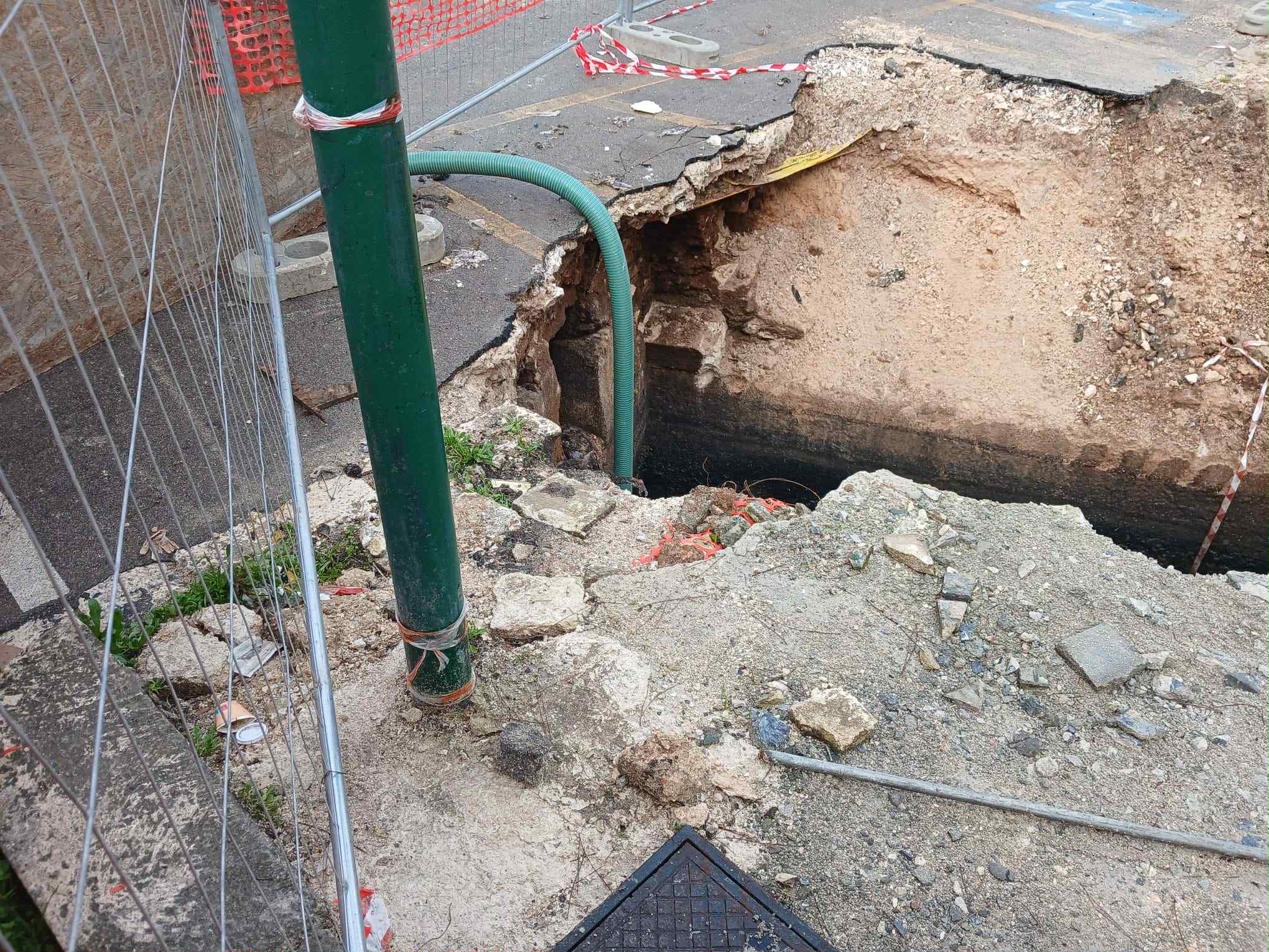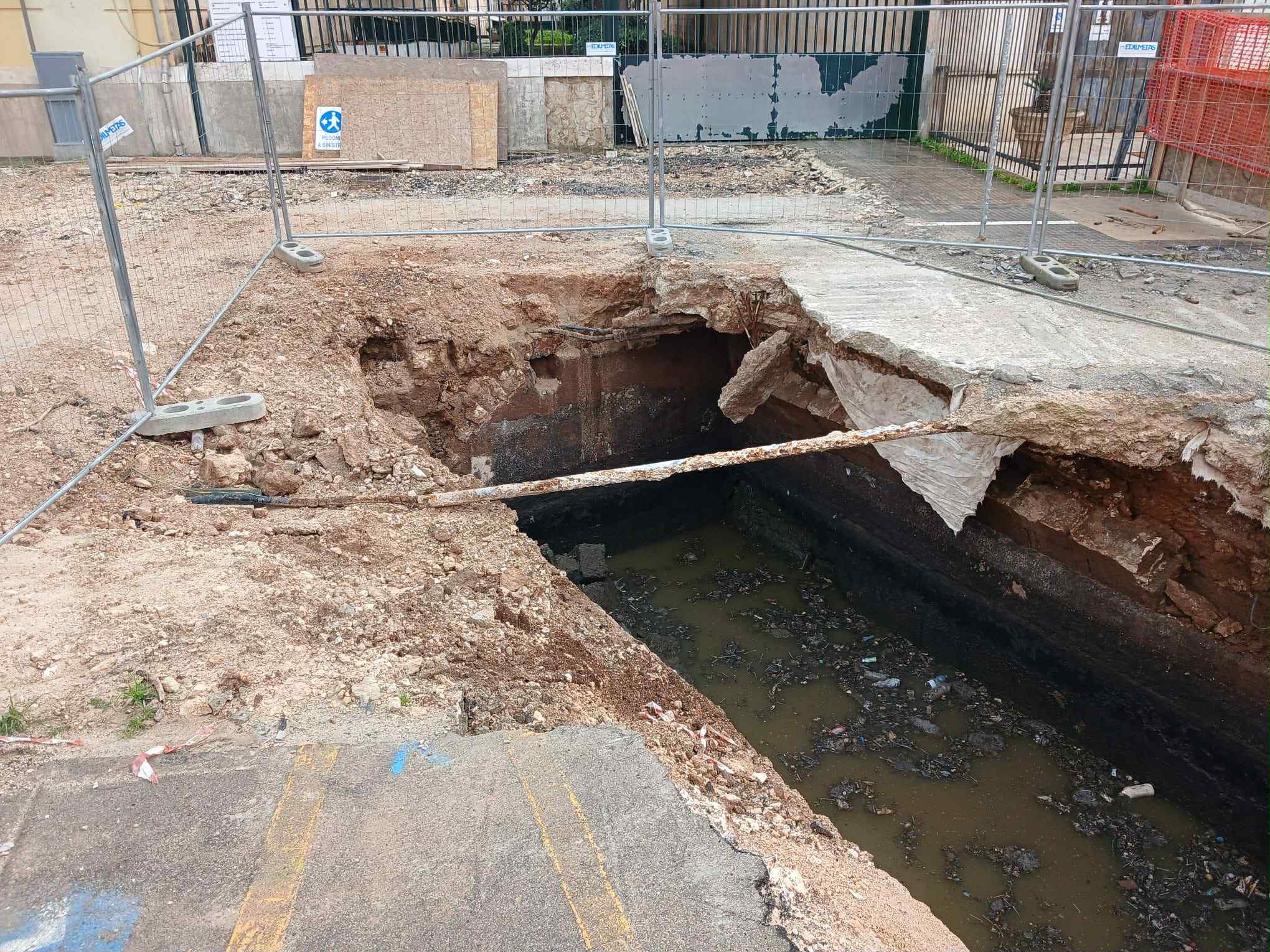 Nel cantiere di viale Mancini un escavatore danneggia una condotta, crolla la volta di un’antica cisterna, emergono liquami, odori nauseabondi, paura e transenne.