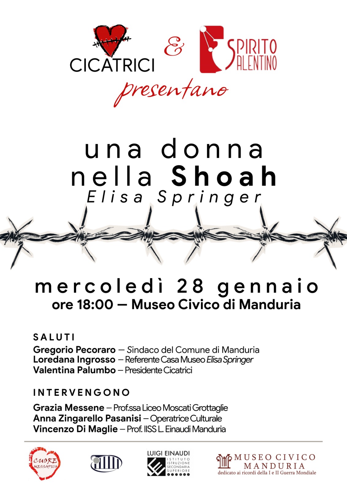 Il cuore dell’incontro entrerà nel vivo con i contributi delle relatrici: la professoressa Grazia Messene (liceo Moscati di Grottaglie) analizzerà il drammatico impatto delle leggi razziali fasciste, mentre l’operatrice culturale Anna Zingarello Pasanisi delineerà un ritratto intimo e profondo della figura di Elisa Springer. Concluderà il professor Vincenzo Di Maglie (IISS L. Einaudi di Manduria), con una riflessione sul significato e sul valore della memoria dell’Olocausto nella società e nella coscienza odierna.