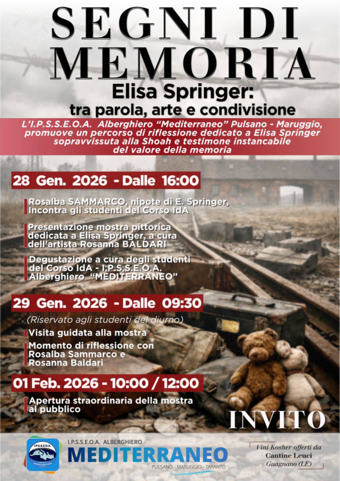 L’IPSSEOA alberghiero “Mediterraneo” di Pulsano e Maruggio promuove un percorso di riflessione dedicato a Elisa Springer sopravvissuta alla Shoah e testimone instancabile del valore della memoria.