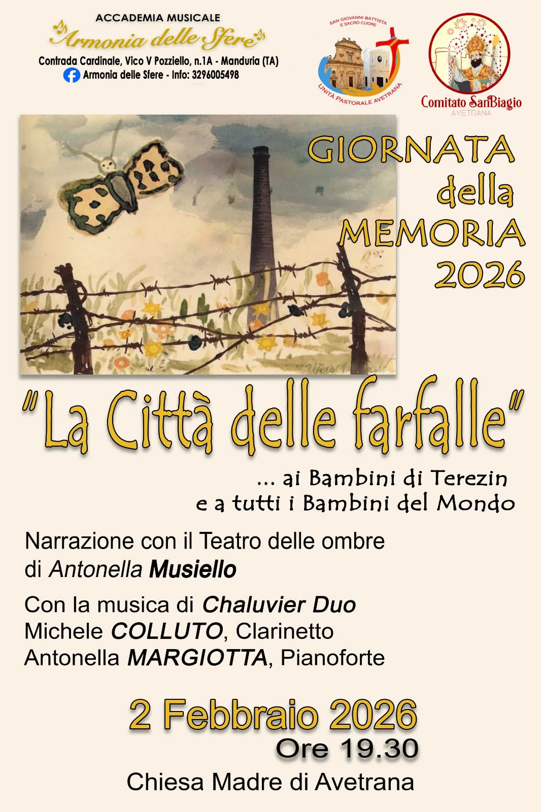 Lo spettacolo musico-teatrale “La città delle farfalle” sarà rappresentato il 2 febbraio, su iniziativa dell’accademia musicale “Armonia delle Sfere”, dell’Unità Pastorale di Avetrana e del comitato “San Biagio”.