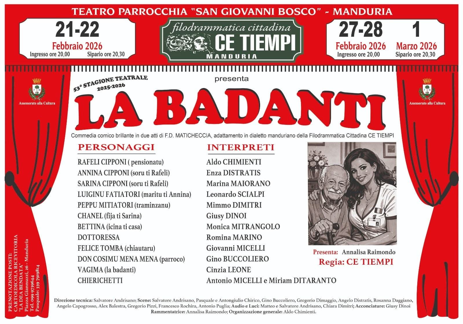 Ecco il cast della Ce Tiempi, che interpreterà, sul palco del teatro della parrocchia San Giovanni Bosco, la commedia comico-brillante in due atti di F. D. Matichecchia, con adattamento in dialetto manduriano della filodrammatica cittadina “Ce Tiempi”.