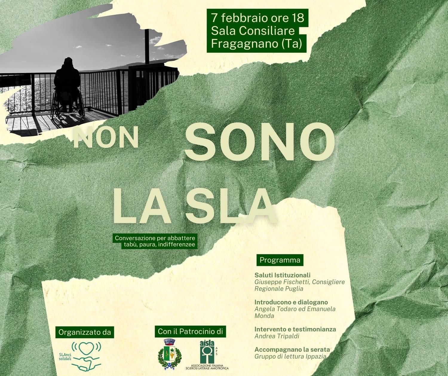 Domani sera, alle ore 18, presso la sala consiliare del Comune di Fragagnano, si terrà l’incontro pubblico “Non sono la SLA”, promosso dall’associazione SLAnci Solidali con il patrocinio del Comune di Fragagnano e dell’AISLA – Associazione Italiana Sclerosi Laterale Amiotrofica.