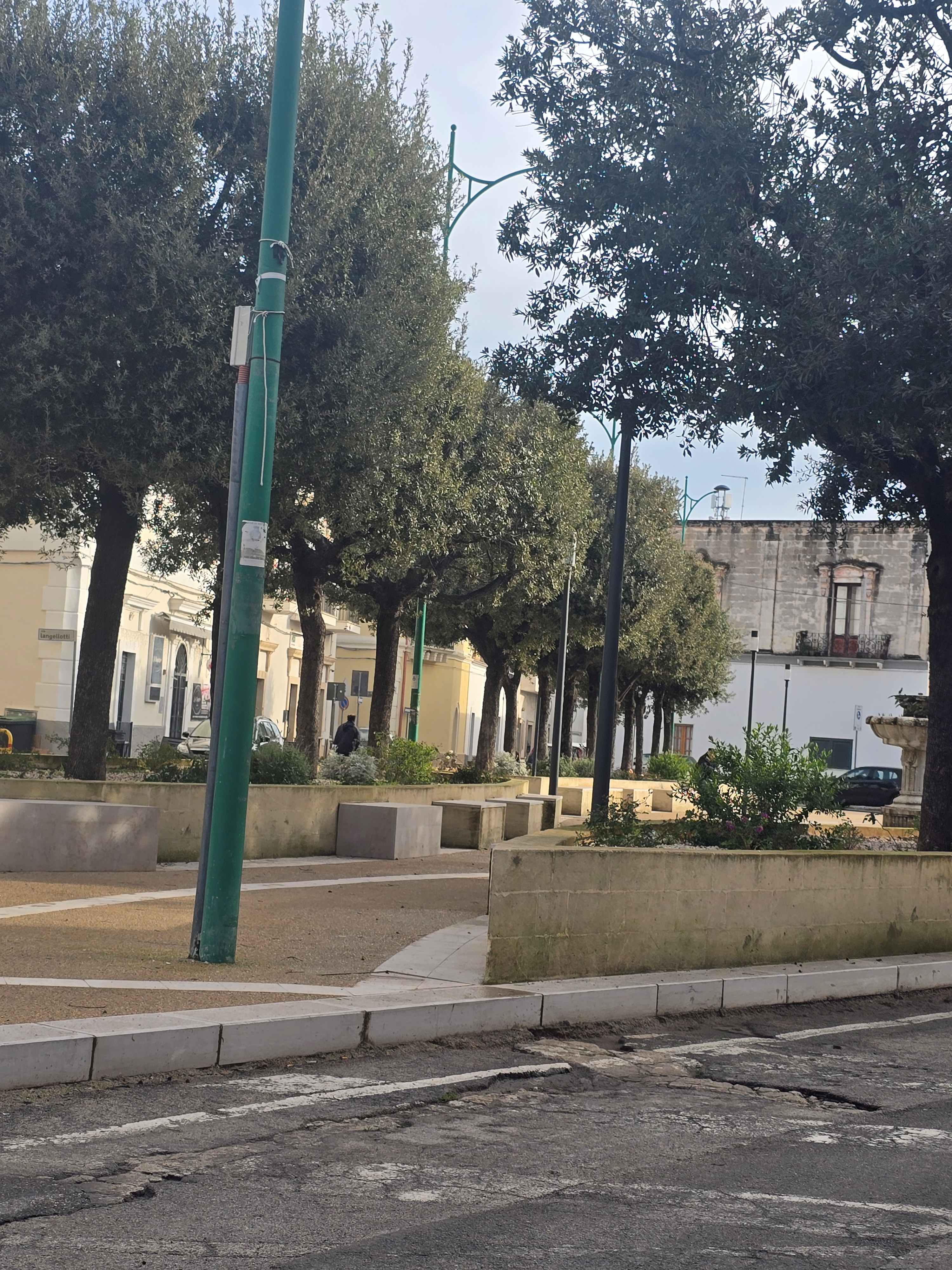 A distanza di poco più di due anni dall’inaugurazione, la piazza si presenta in condizioni incompatibili con un’opera pubblica di recente realizzazione: muretti invasi da muffa e vegetazione, panchine incomplete e deteriorate, impianti di illuminazione privi di adeguata sistemazione, alberi rimossi e mai ripristinati, fontana parzialmente funzionante con continue perdite d’acqua, pavimentazione già segnata da evidenti segni di deterioramento.