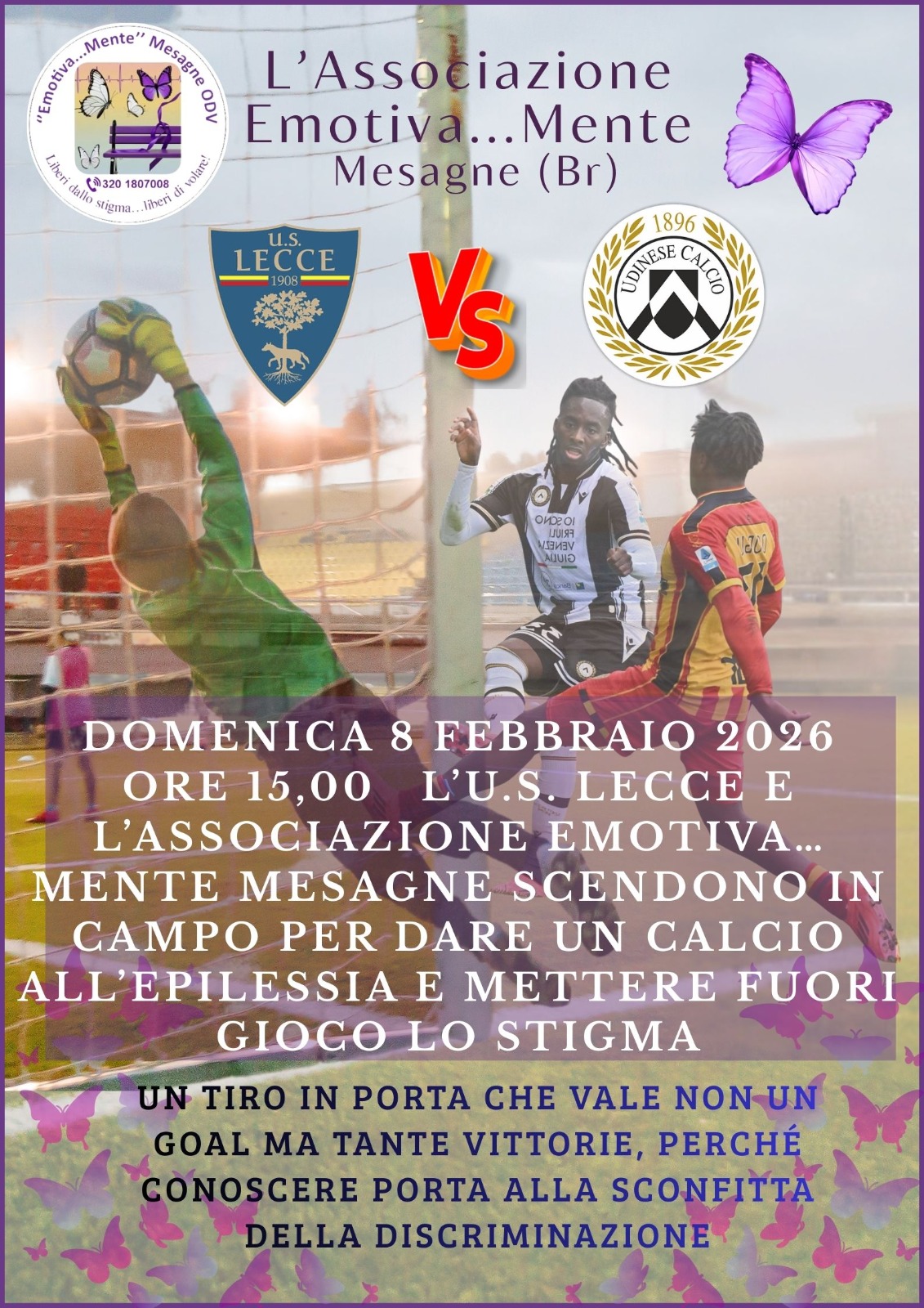 L’U.S. Lecce per celebrare la Giornata Internazionale dell’Epilessia, che ogni anno ricorre il secondo lunedì del mese di Febbraio, grazie alla caparbietà, sensibilità e attenzione dei suoi massimi dirigenti e in primis la moglie del presidente Saverio Sticchi Damiani, Marina, ha voluto fortemente che l’associazione Emotiva…Mente Mesagne che si occupa di Epilessia, fosse presente con una propria rappresentanza allo stadio di Via Del Mare in occasione della partita Lecce-Udinese di oggi 8 febbraio, esponendo un proprio striscione con su scritto “Mettiamo in panchina l’epilessia”, facendo volare dei palloncini viola, colore dello stigma, a significare che la discriminazione debba volare via.