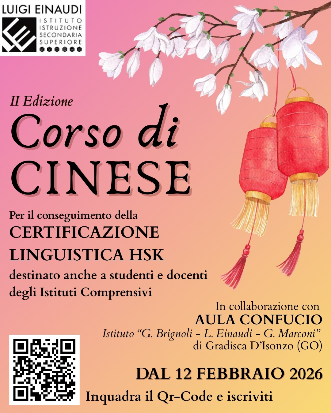 L’IISS “Einaudi” di Manduria, grazie al protocollo d’intesa con l’Aula Confucio dell’ISIS “G. Brignoli – L. Einaudi – G. Marconi” di Gradisca d’Isonzo (GO), anche per l’a.s. 2025-2026 ha attivato il corso di lingua cinese di livello base, propedeutico al conseguimento della certificazione linguistica HSK 1.