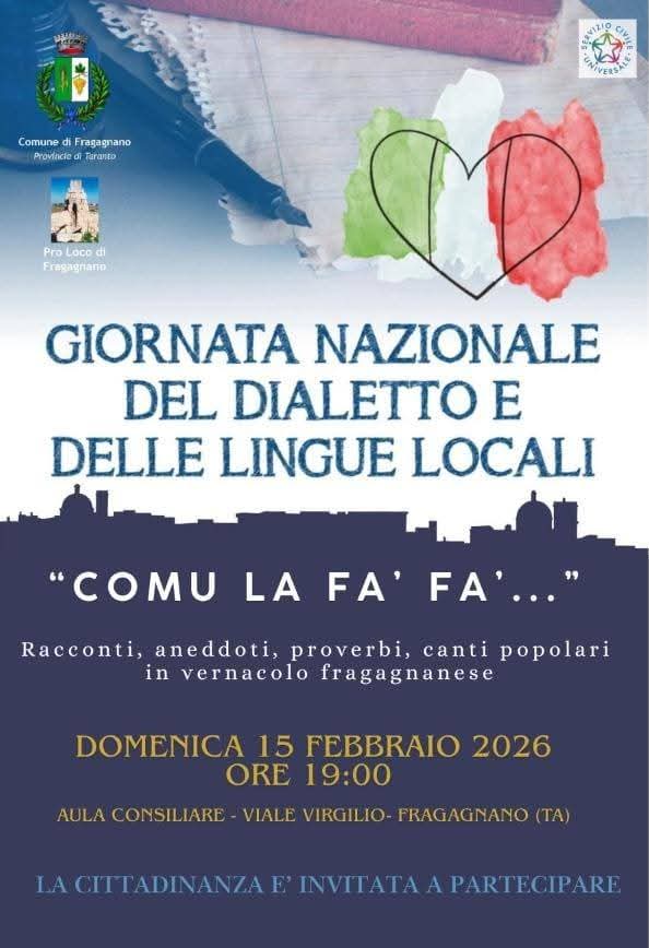 Domenica 15 febbraio, alle ore 19, presso l’aula consiliare del Comune di Fragagnano (adiacente alla caserma), la Pro Loco, con il patrocinio del Comune di Fragagnano, organizza una serata speciale interamente dedicata al dialetto fragagnanese dal titolo “Comu la fa’ fa’…”.