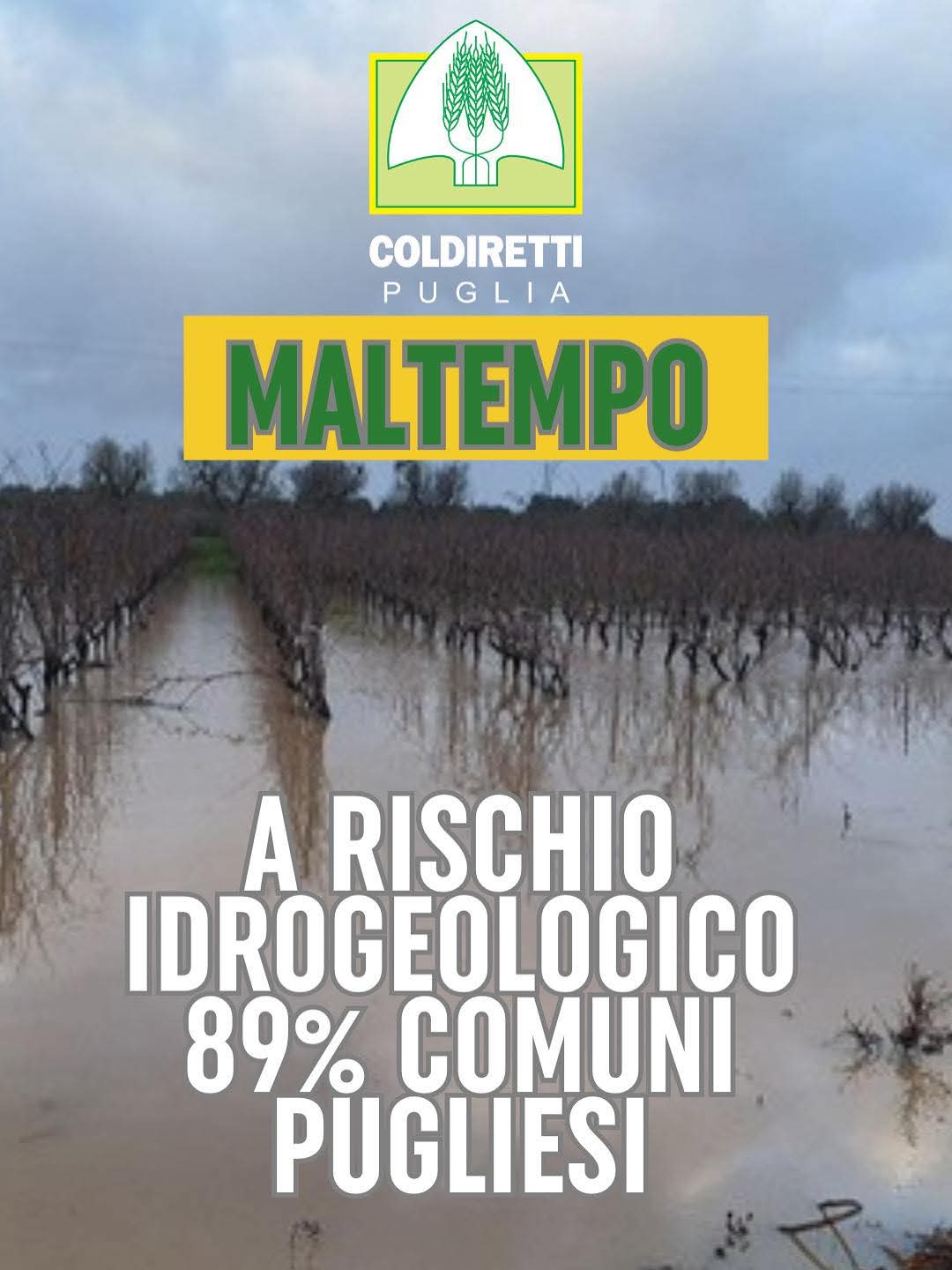 La pioggia può salvare la Puglia dalla siccità, ma quando diventa estrema si trasforma in una minaccia per il territorio. Oggi l’89% dei comuni pugliesi è a rischio dissesto idrogeologico e il 9,1% della superficie regionale è classificato a pericolosità da frana, con aree dove il rischio è elevato o molto elevato. È quanto emerge dall’analisi di Coldiretti Puglia su dati ISPRA.