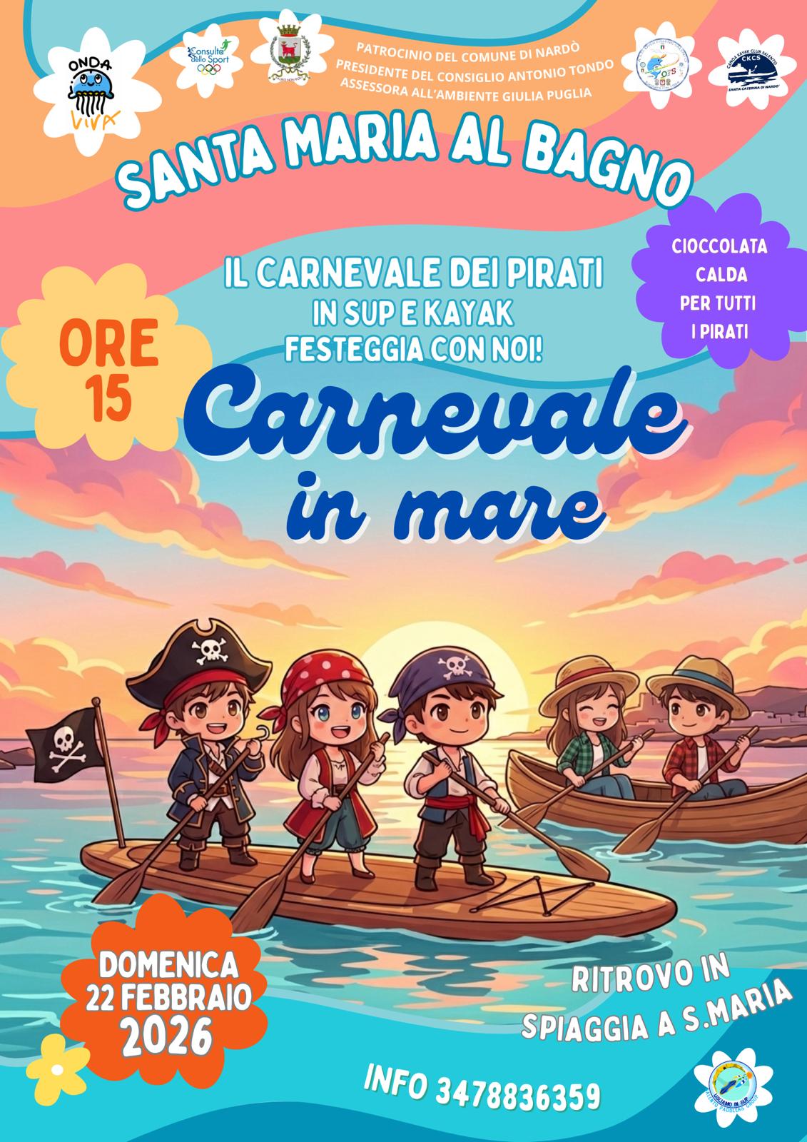 La marina di Santa Maria al Bagno sarà il cuore pulsante delle celebrazioni grazie a una doppia iniziativa che vedrà coinvolti mare e terra. L’organizzazione del “Carnevale in Mare – Il Carnevale dei Pirati” è affidata all'associazione Onda Viva: a partire dalle ore 15, una spettacolare flotta di pirati in SUP e Kayak colorerà lo specchio d’acqua antistante la spiaggia, dove è fissato il ritrovo.